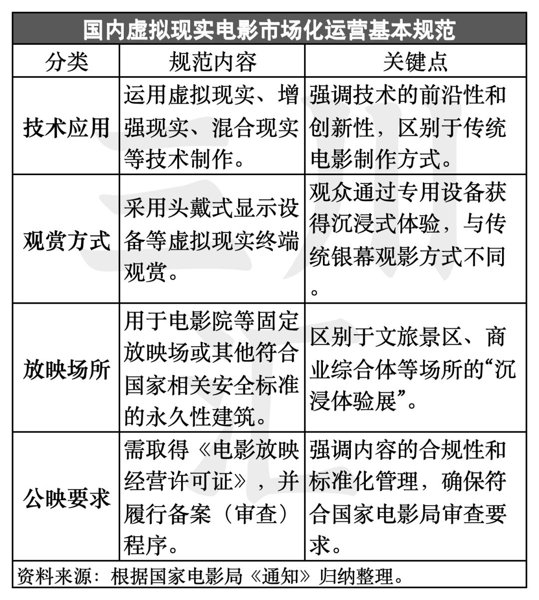 根据国家电影局《通知》定义, 虚拟现实电影是指运用虚拟现实(含增强现实、混合现实)有关技术制作、采用头戴式显示设备等虚拟现实终端观赏、用于电影院等固定放映场所公开放映的新形态电影。 需要特别强调的是,这一定义不涉及文旅景区、文博场馆内或商业综合体内展陈的虚拟现实“沉浸体验展”等现有的各种业态。