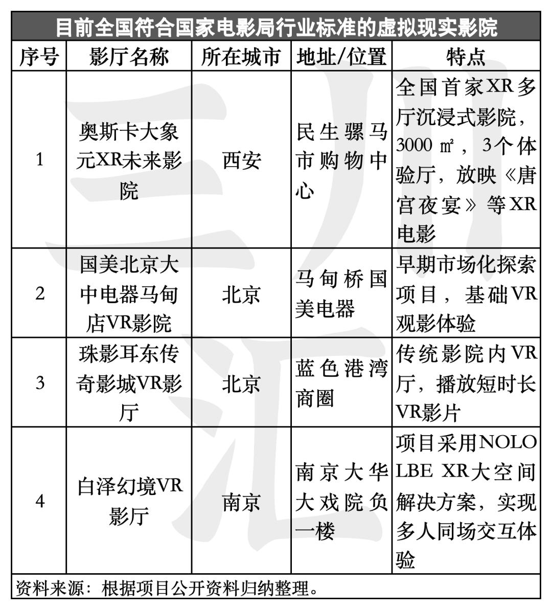 《通知》明确“支持开拓利用电影院内空间或其他符合国家相关安全标准的永久性建筑放映虚拟现实电影。 ”这也意味着传统影院可通过增设VR影厅实现升级,提供多样化观影体验。例如,西安首家XR多厅未来影院已实现商业化运营。同时,政策允许在商业综合体、文旅场馆等符合安全标准的场所放映申请《电影放映经营许可证》并接入全国电影票务系统,并享受电影产业扶持政策,为未来虚拟现实电影行业与文旅、商务等行业跨界融合预留了政策空间。
