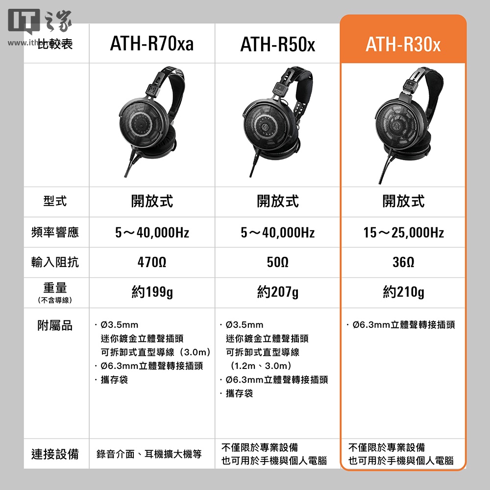 IT之家附铁三角 R 系列耳机参数对比表: