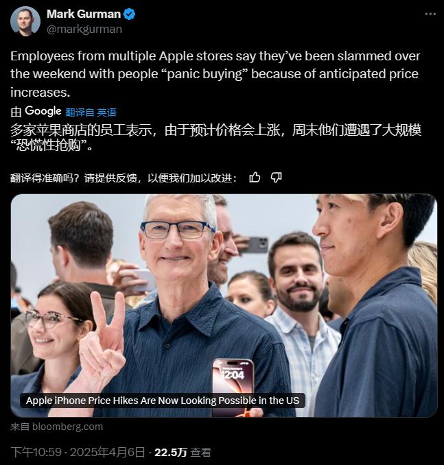 面对这种情况,专注苹果的科技记者马克・古尔曼表示,刚刚过去的周末,苹果美国门店人潮爆满,很多人担心iPhone即将涨价,出现恐慌性抢购。