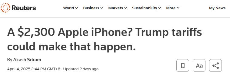如此疯狂的加税,即便是苹果也没法 是自行消化关税成本,转嫁给消费者成为必然。