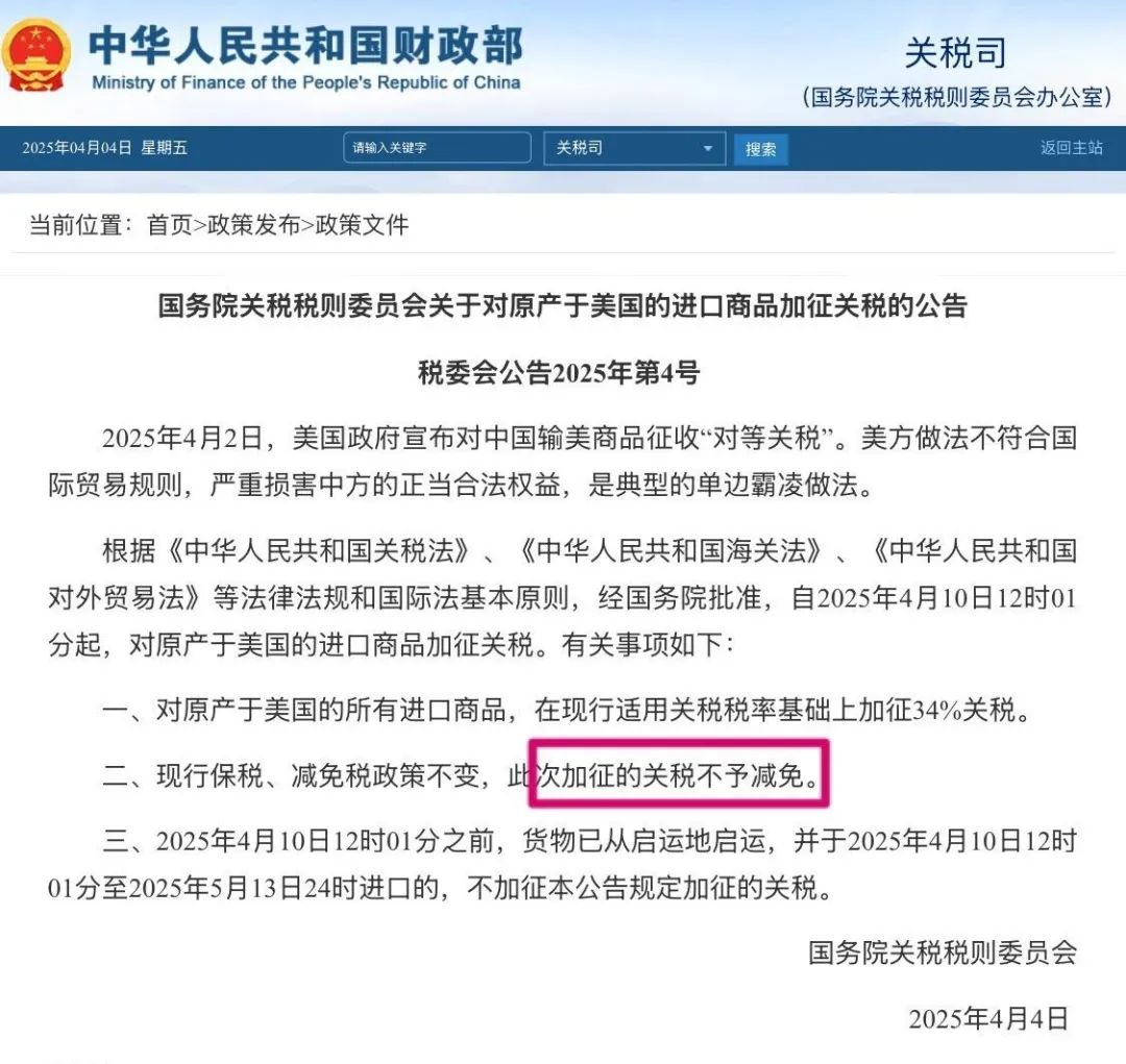 对原产于美国的进口商品加征34%关税;现行保税、减免税政策不变,此次加征的关税不予减免。