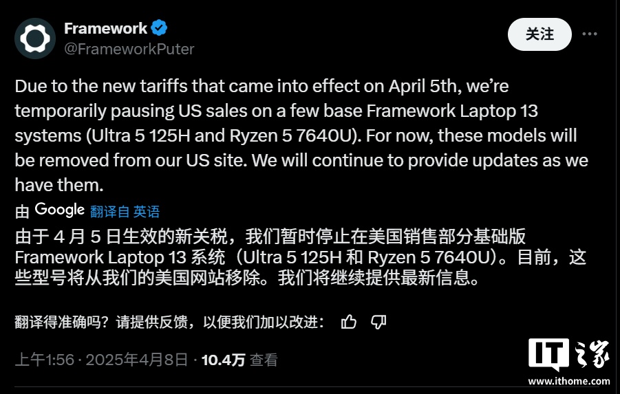 IT之家 4 月 8 日消息,美国电脑制造商 Framework 宣布,由于特朗普政府于 4 月 5 日生效的关税政策,将“暂时暂停”在美国销售部分笔记本电脑。