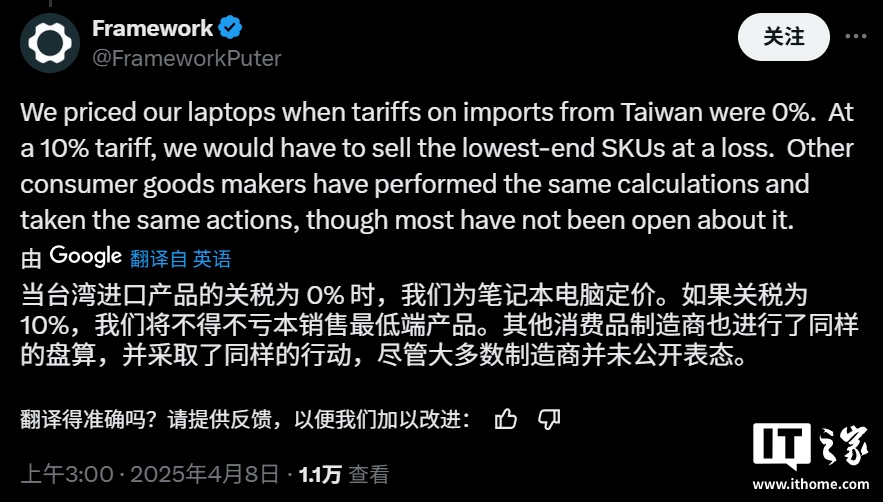 IT之家注意到,Framework 在另一篇帖子中解释称:“我们在为笔记本电脑定价时,台湾地区进口商品的关税税率为 0%。在 10% 的关税下,我们销售最低端的型号将面临亏损。”