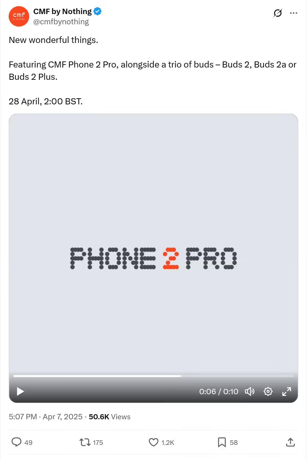 凤凰网科技讯(作者/于雷) 4月8日,Nothing旗下子品牌CMF今日宣布,将于4月28日推出四款全新硬件产品,包括CMF Phone 2 Pro智能手机及三款真无线耳机CMF Buds 2、2a、2 Plus。