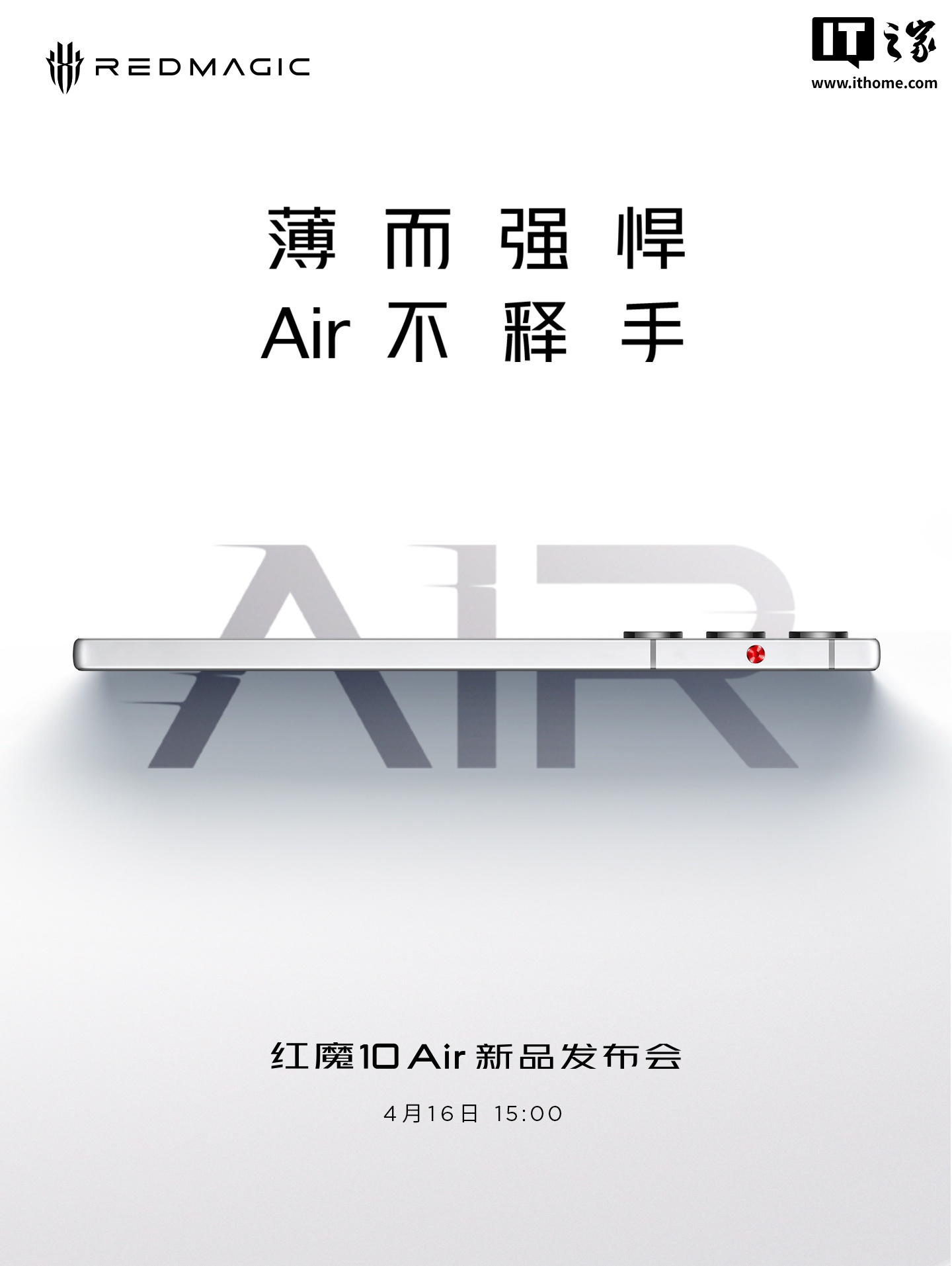 IT之家 4 月 8 日消息,红魔游戏手机今日官宣,红魔 10 Air 新品发布会定档 4 月 16 日 15:00,新机口号为“薄而强悍、Air 不释手”。