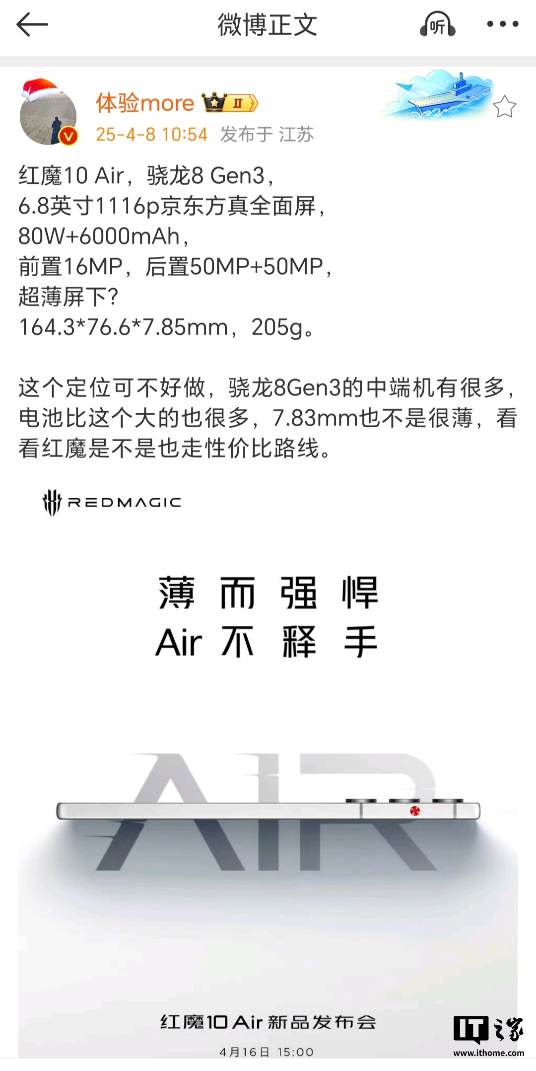 IT之家 4 月 8 日消息,红魔 10 Air 新品发布会定档 4 月 16 日 15:00,新机口号为“薄而强悍、Air 不释手”,且号称是“红魔史上最轻薄全屏旗舰”。