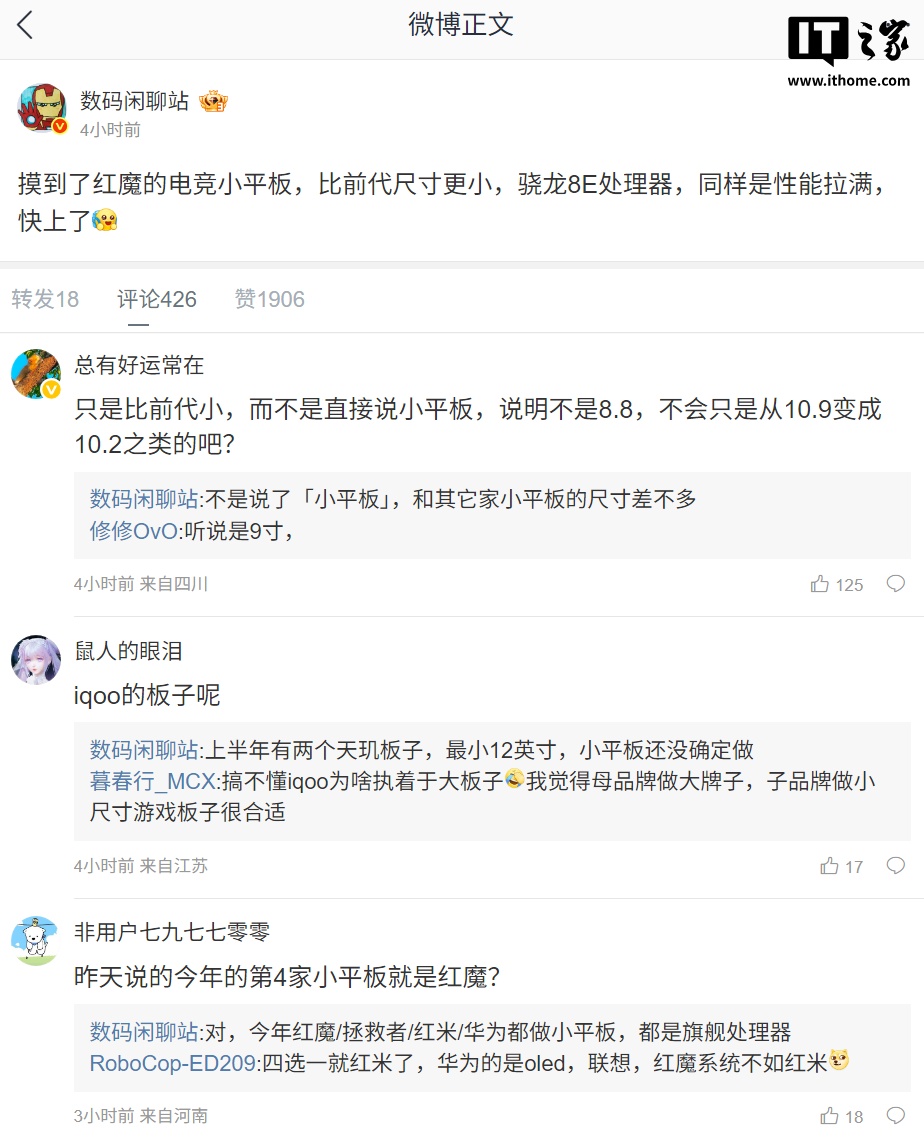 爆料还称,今年红魔 / 拯救者 / REDMI / 华为都做小平板,都是旗舰处理器。