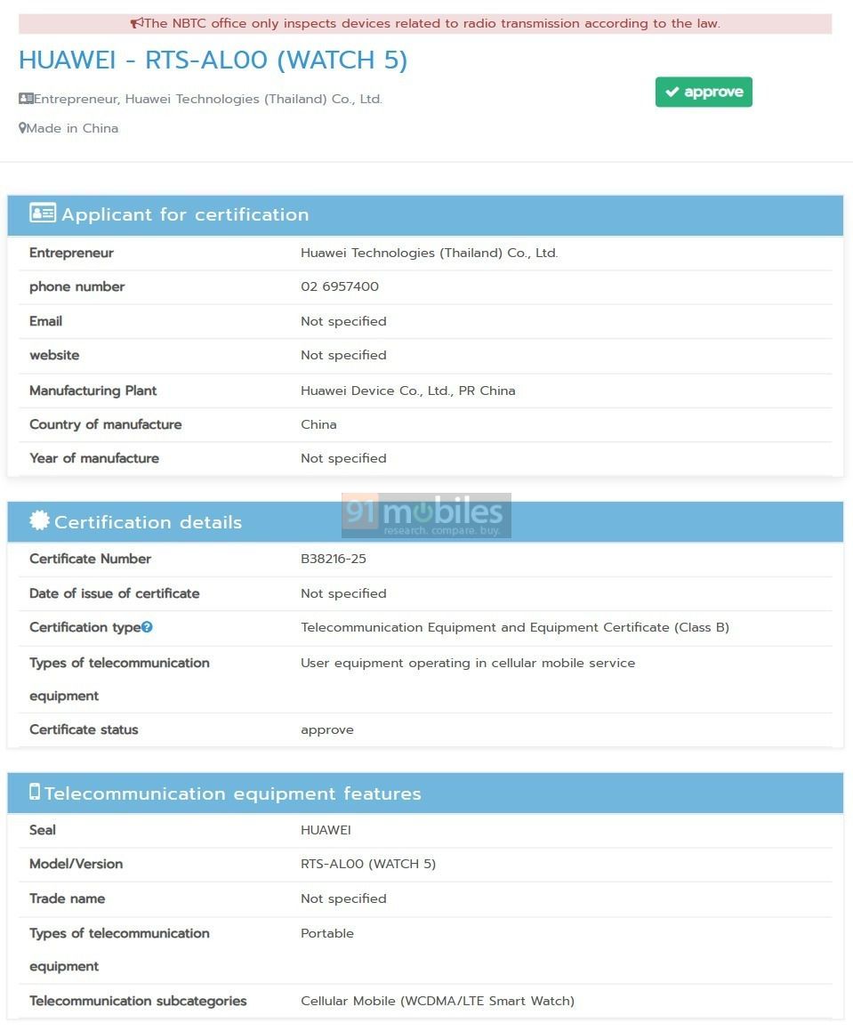 另一款新品 Huawei Watch 5 已通过泰国 NBTC 认证,型号为 RTS-AL00,制造商信息指向华为中国公司。认证文件暗示该设备可能推出支持 LTE 网络的蜂窝版本,与 Wi-Fi 版同步发售,Watch 5 属于华为数字系列,定位或高于 Fit 系列。