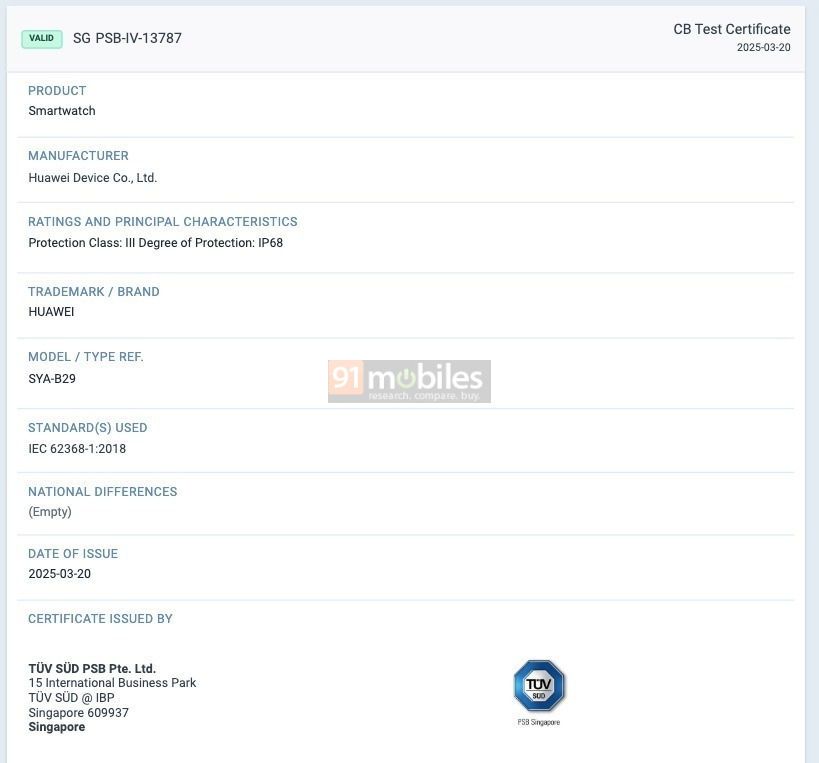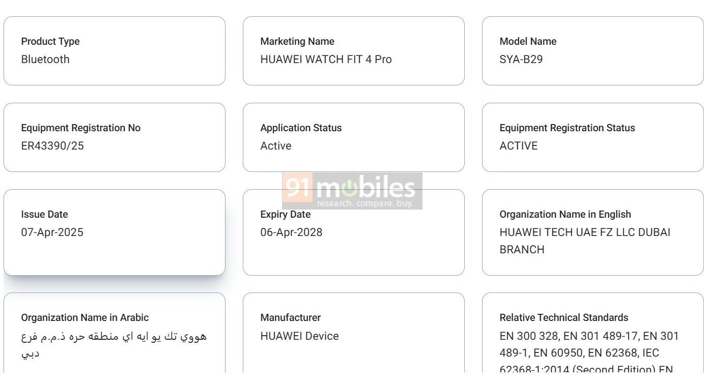 华为 Watch Fit 4 Pro 近期接连通过 TDRA 和 TUV SUD 两大机构认证。TDRA 文件显示,其型号为 SYA-B29(注册号 ER43390/25),归类为蓝牙设备,有效期至 2028 年 4 月。