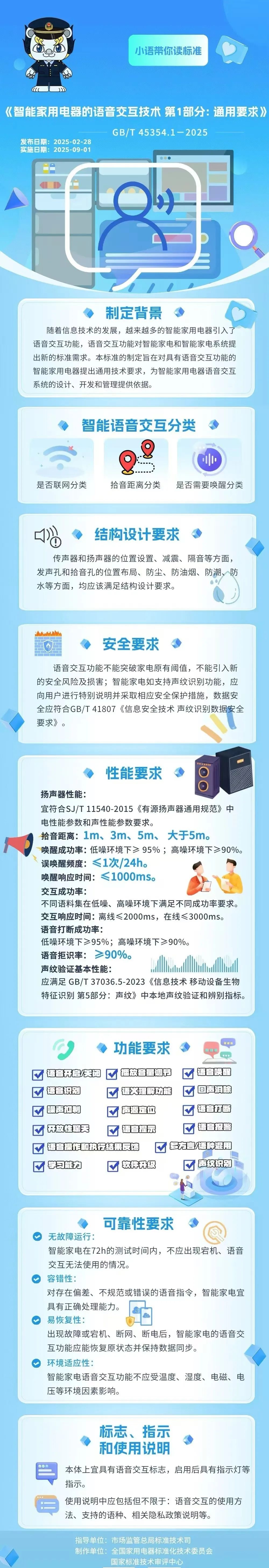 该标准对智能家电的语音交互功能进行了分类,明确了语音交互的框架结构,从结构设计、安全性、功能性、标注标识等方面提出技术要求。