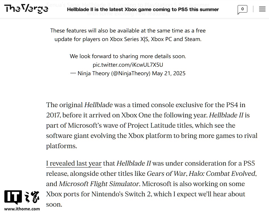 据外媒 The Verge 记者 Tom Warren 昨日披露,在微软宣布《地狱之刃 II:塞娜的传说增强版》将于今年夏季登陆 PlayStation 5 的同时,微软也在为任天堂 Switch 2 开发一些 Xbox 游戏的移植版本,他预计这些游戏很快就会公开。