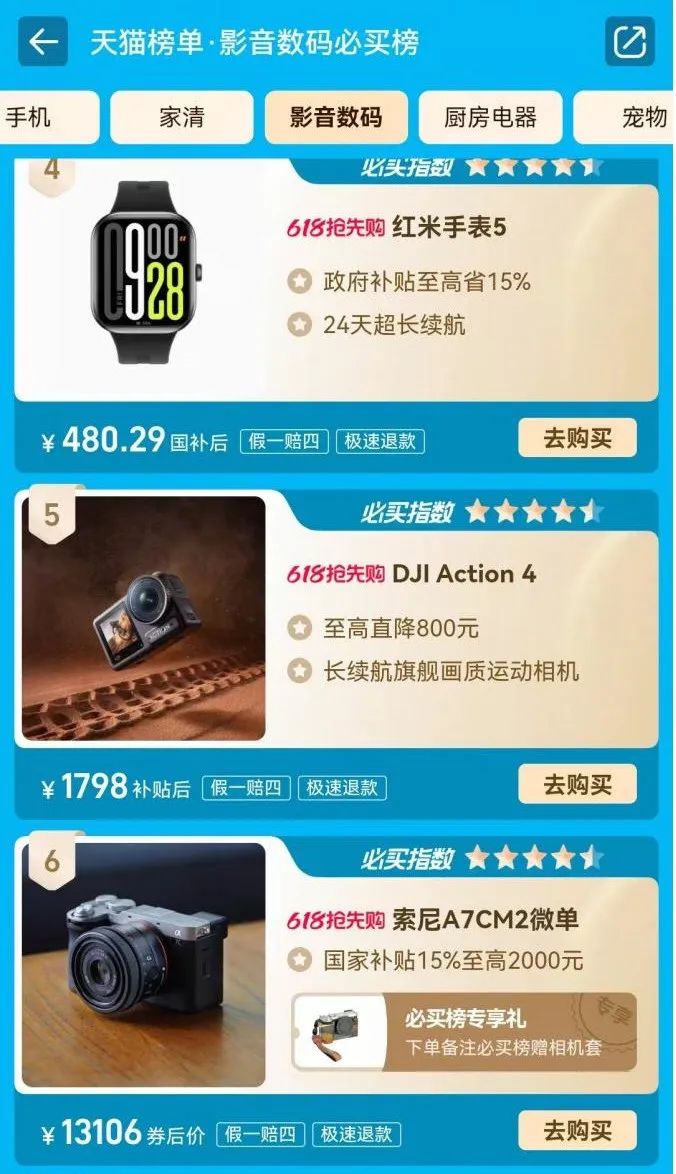 5月22日天猫618影音数码必买榜上,大疆运动相机Action 4排在索尼微单前面