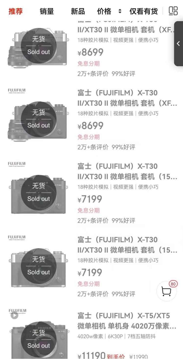 在微单领域,富士相机更一度被称为年轻人的“电子茅台”,热门机型X-T30、X-T50、X100VI等型号供不应求。
