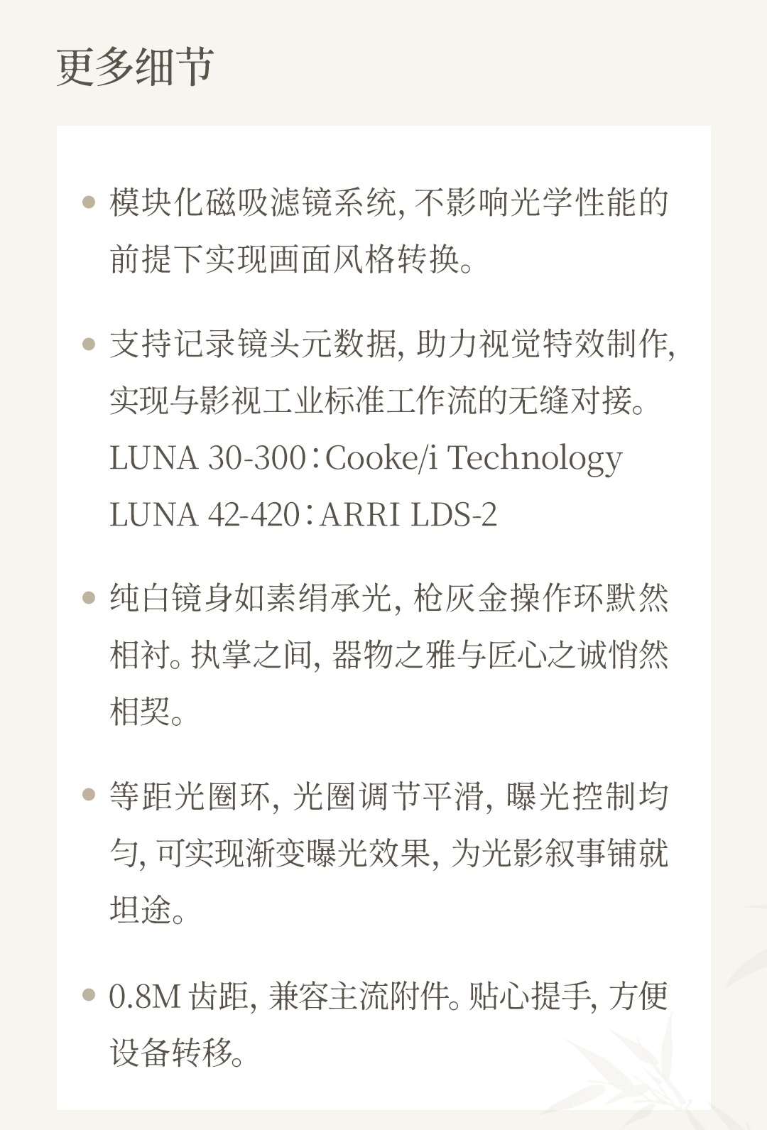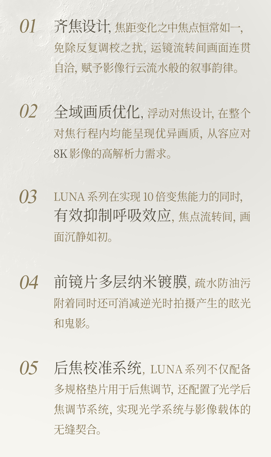 LUNA 系列在实现 10 倍变焦能力的同时,有效抑制呼吸效应。