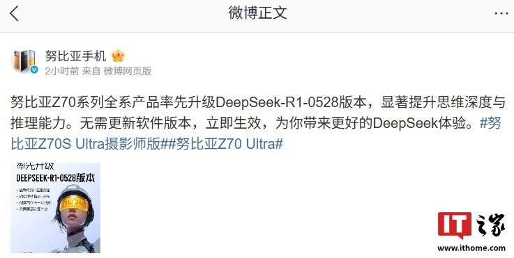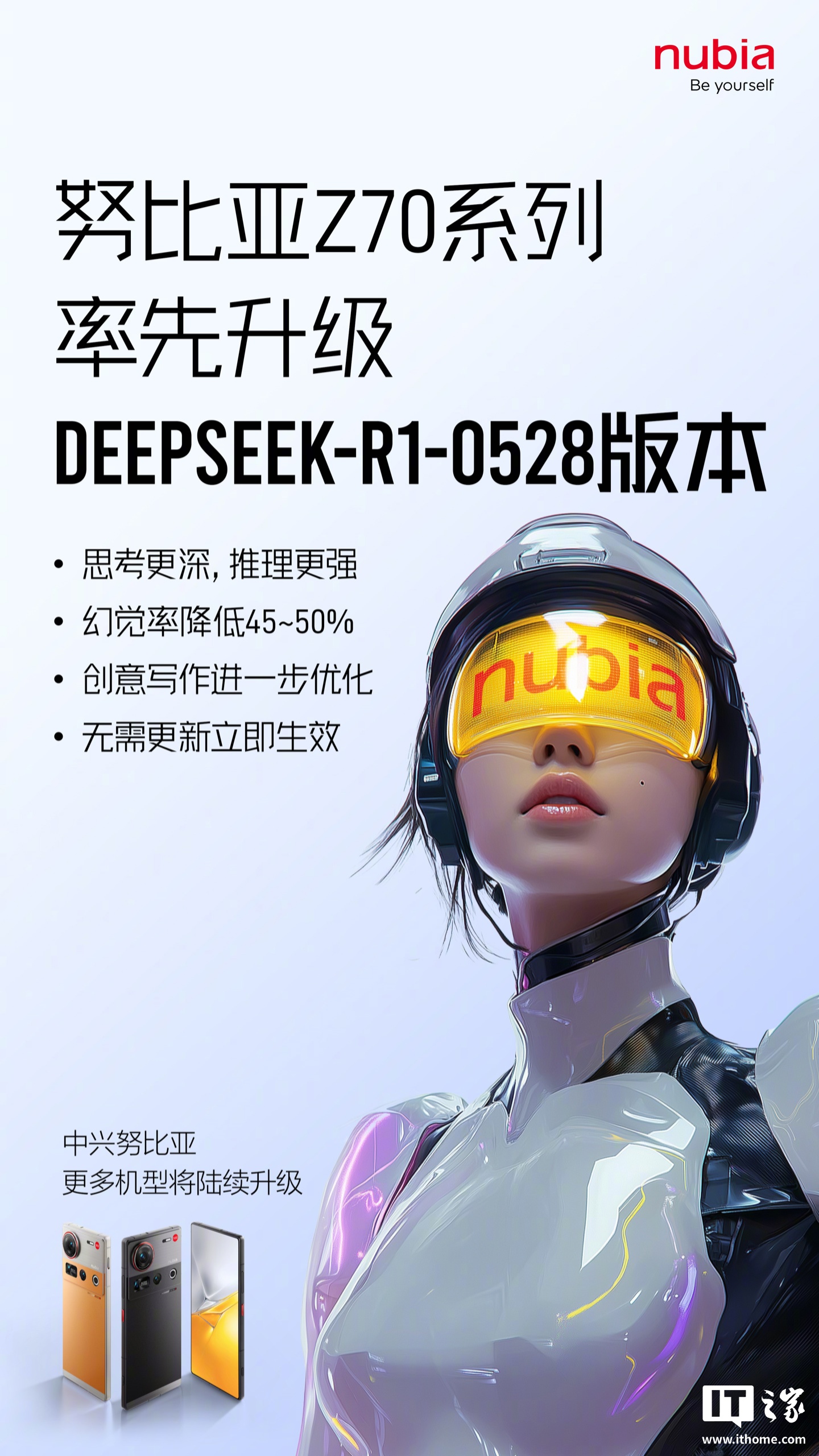 IT之家 6 月 3 日消息,努比亚手机官方今日发文宣布:努比亚 Z70 系列全系产品率先升级 DeepSeek-R1-0528 版本,显著提升思维深度与推理能力。无需更新软件版本,立即生效。