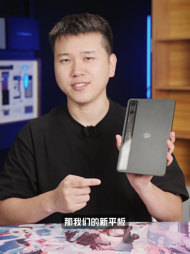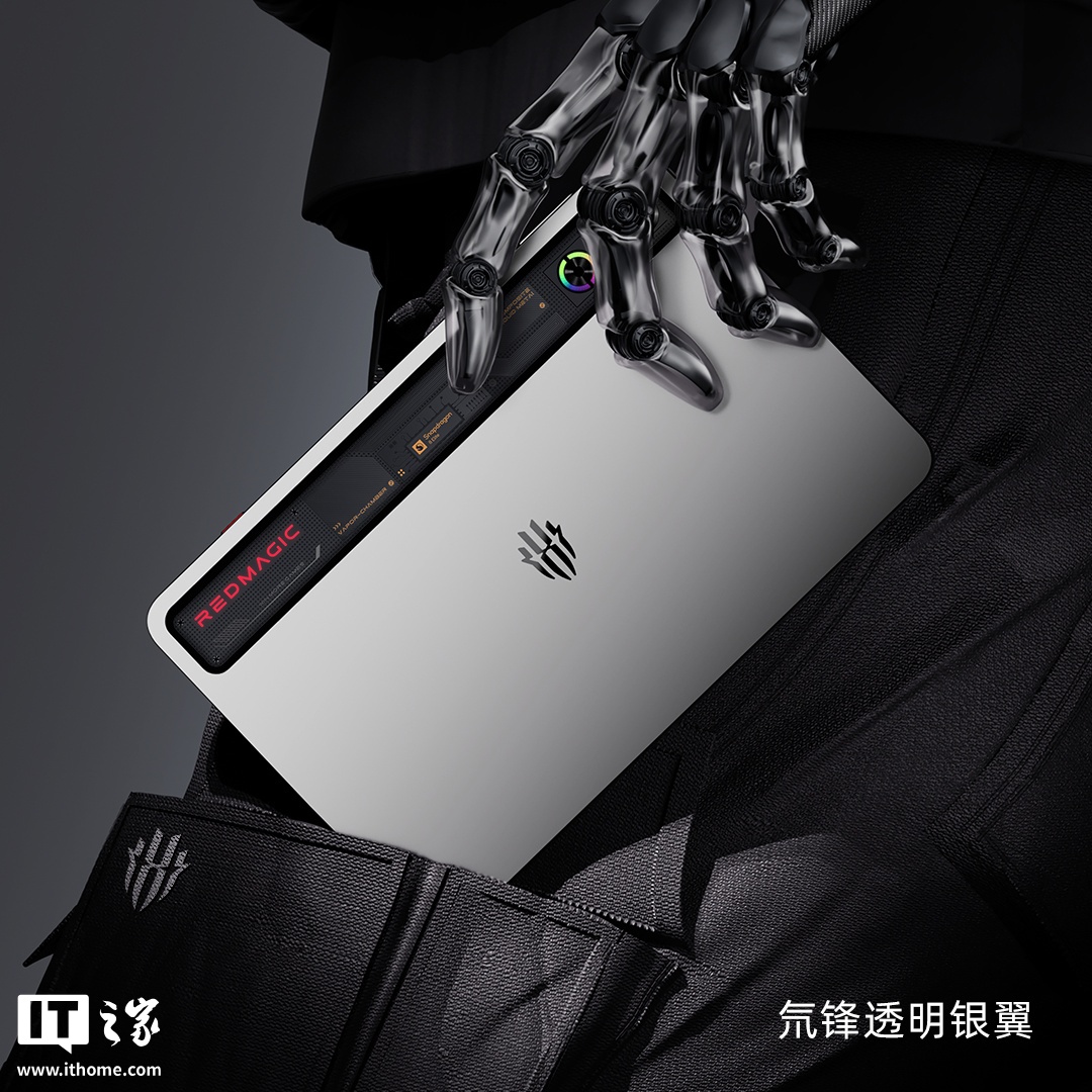 该机外观已公布,其采用氘锋透明设计,提供氘锋透明暗夜和氘锋透明银翼两款配色,背部有一个垂直排列的矩形透明条带,条带展示了内部组件,带 RGB 灯效的部件可能是散热风扇。平板侧面还有一个显眼的红色按钮。