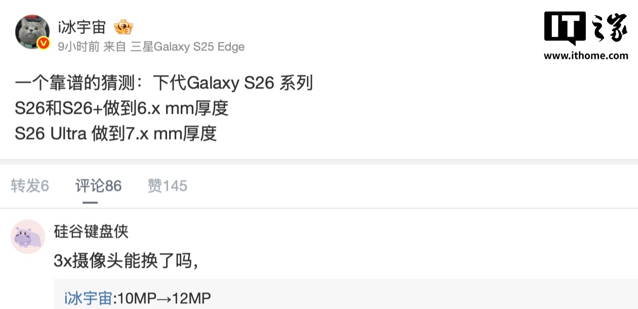 IT之家 6 月 4 日消息,微博博主 i 冰宇宙今日爆料称,三星将在 S26 系列中升级 3 倍长焦摄像头,并且可能降低机身厚度。