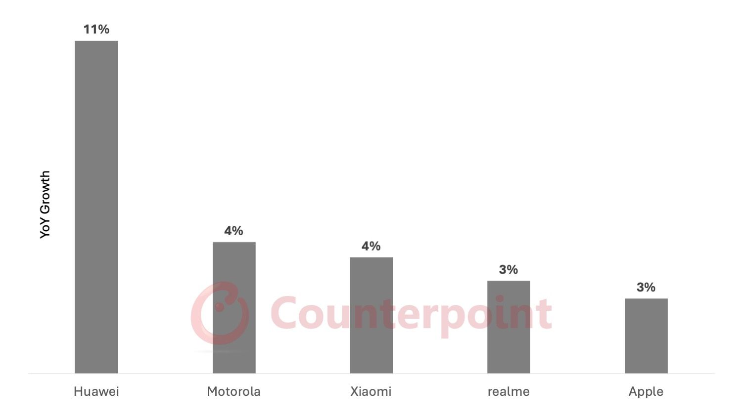 而华为成为最大的亮点,该机构副总监 Ethan Qi 指出,华为供应链瓶颈逐步缓解,自研芯片势头强劲,有望在中国中低端市场抢占更多份额,预估 2025 年全年出货量增长 11%。