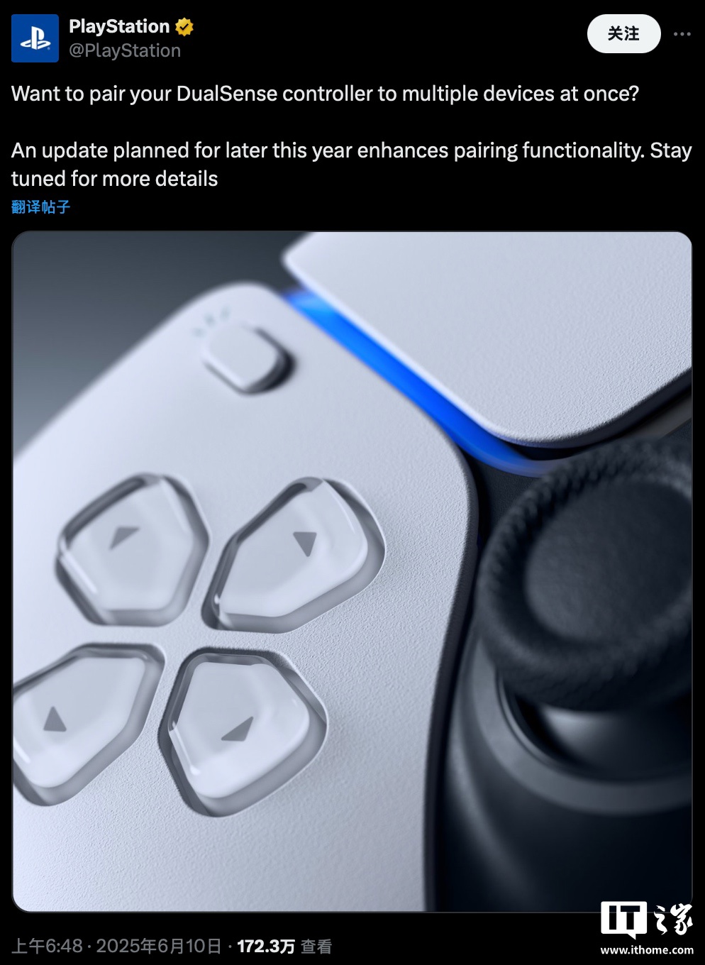 PlayStation 官方 X 账号昨日透露,计划在今年晚些时候为 DualSense 手柄更新配对功能,使其可同时配对多个设备,不过具体操作方式和更新时间尚未明确。
