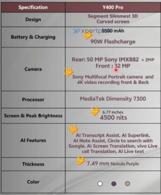 外媒称 Y400 Pro 电池容量为 5500mAh(前代 6500mAh),将提供白色、金色和紫色三种配色可选,具体上市时间尚未确定。