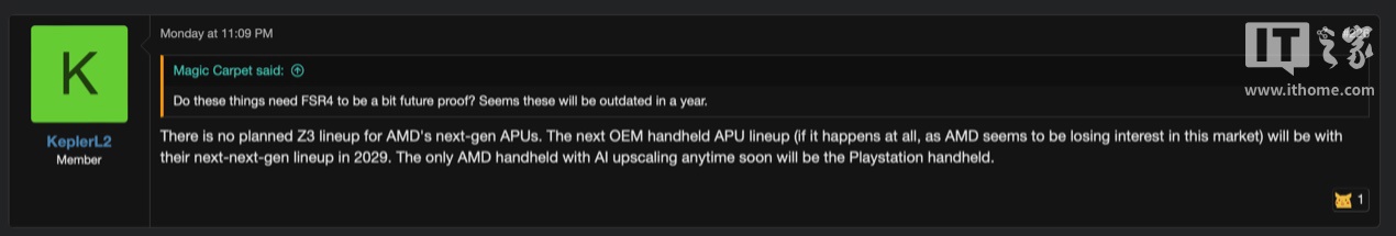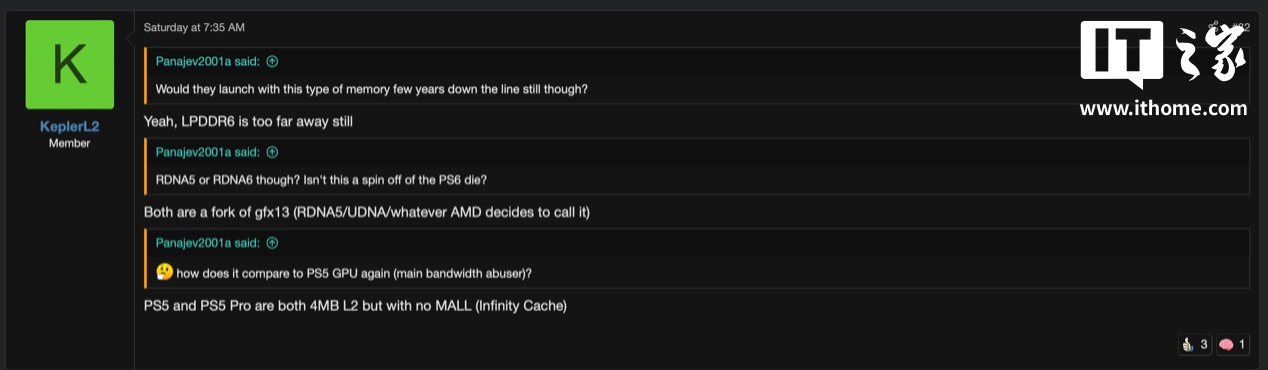 最后,在回复该掌机采用何种架构时,该消息人士表示该掌机与 PS6 都将基于 gfx13 (RDNA5 / UDNA) 架构的一个分支;同时该掌机将配备 4MB L2 缓存和 16MB MALL 缓存(IT之家备注:指无限缓存,该缓存是 AMD 针对其 RDNA 2 GPU 架构所设计的一个重要技术,可提升效率和降低延迟)。
