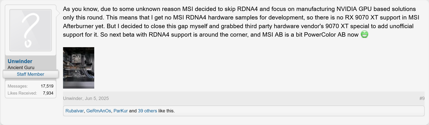 为解决这一问题,Afterburner 开发者 Unwinder 决定自购来自第三方企业(IT之家注:从上下文来看是 PowerColor 撼讯)的 RX 9070 XT 显卡,以实现对 "RDNA 4" 的非官方支持,相关更新将于下个 beta 测试版推出。