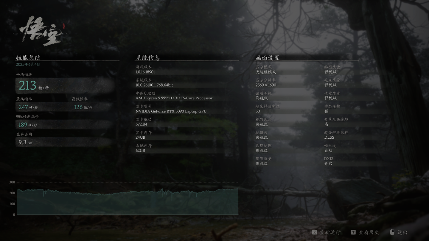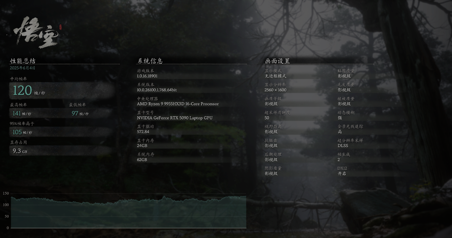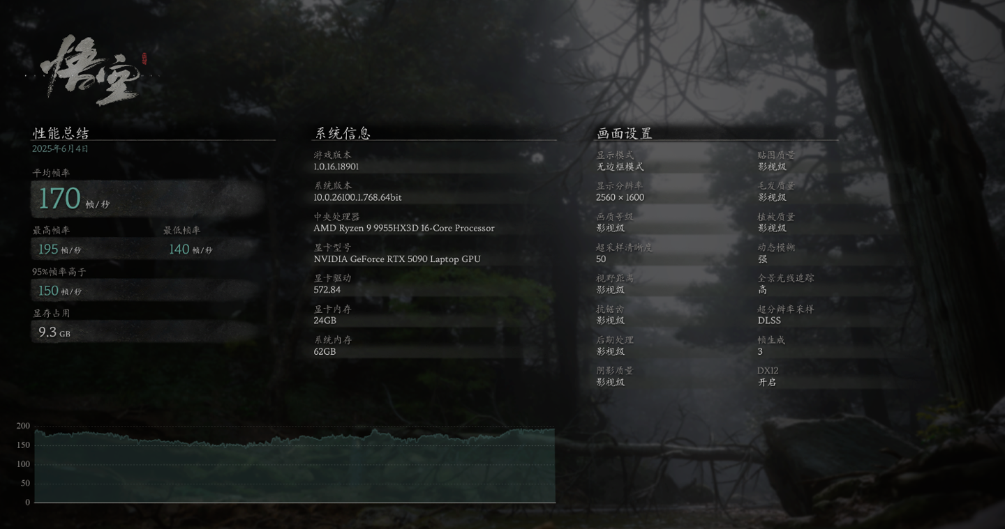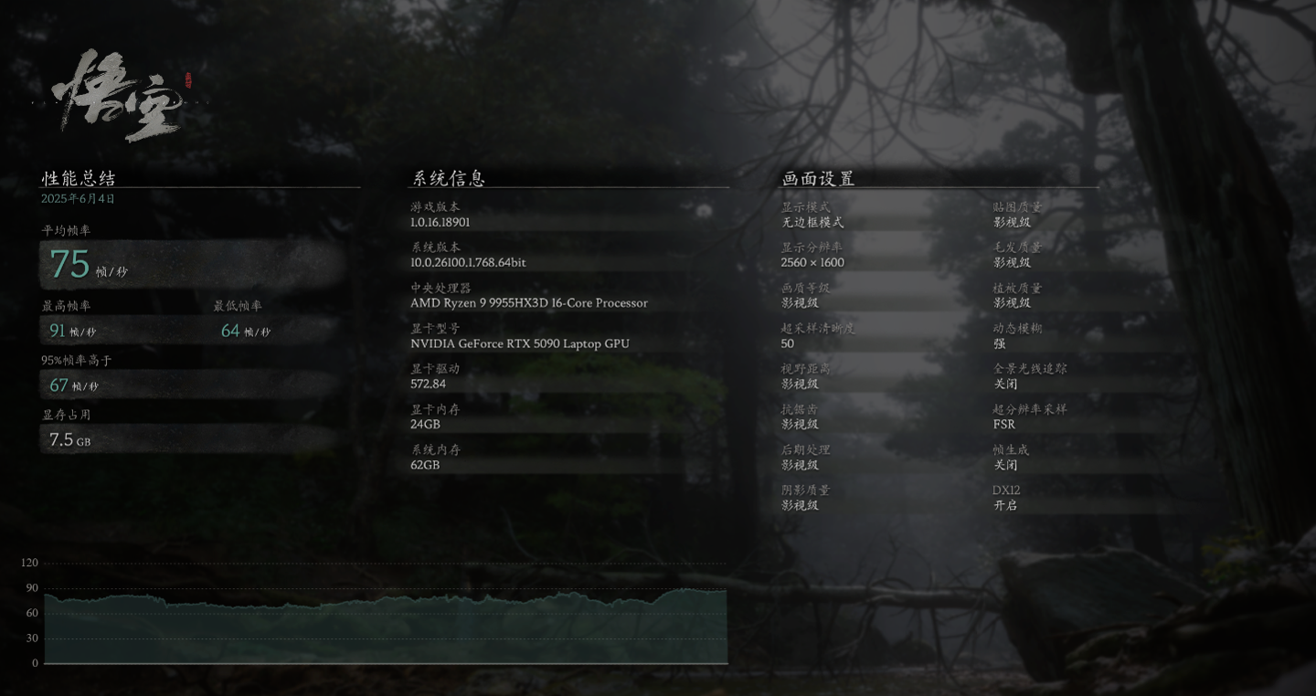 接下来是对性能要求更高的《黑神话:悟空》,2.5K 分辨率加影视级画质,50% 超采样加 TSR,关闭光线追踪的情况下,没有 DLSS 帧生成功能的帮助,游戏平均帧数能达到 75 fps,已经能达到畅玩的水平了。