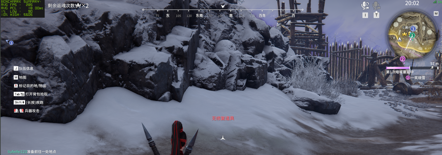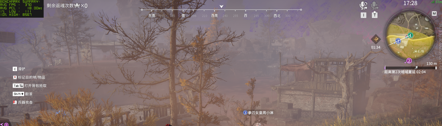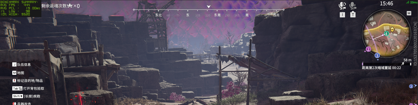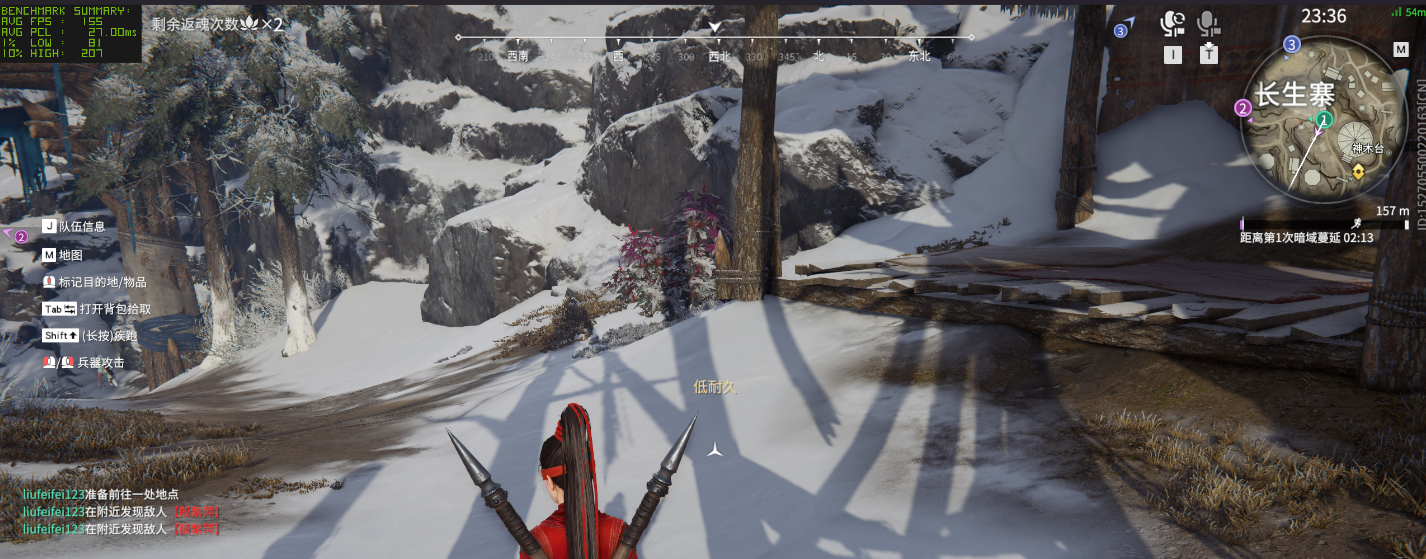 然后还是一款在线竞技游戏《永劫无间》,首先在 2.5K 最高画质下,不开启 DLSS 相关功能,此时游戏平均帧数为 155 fps,1% Low 帧 81 帧,这个成绩已经能基本满足在线竞技的需求了。
