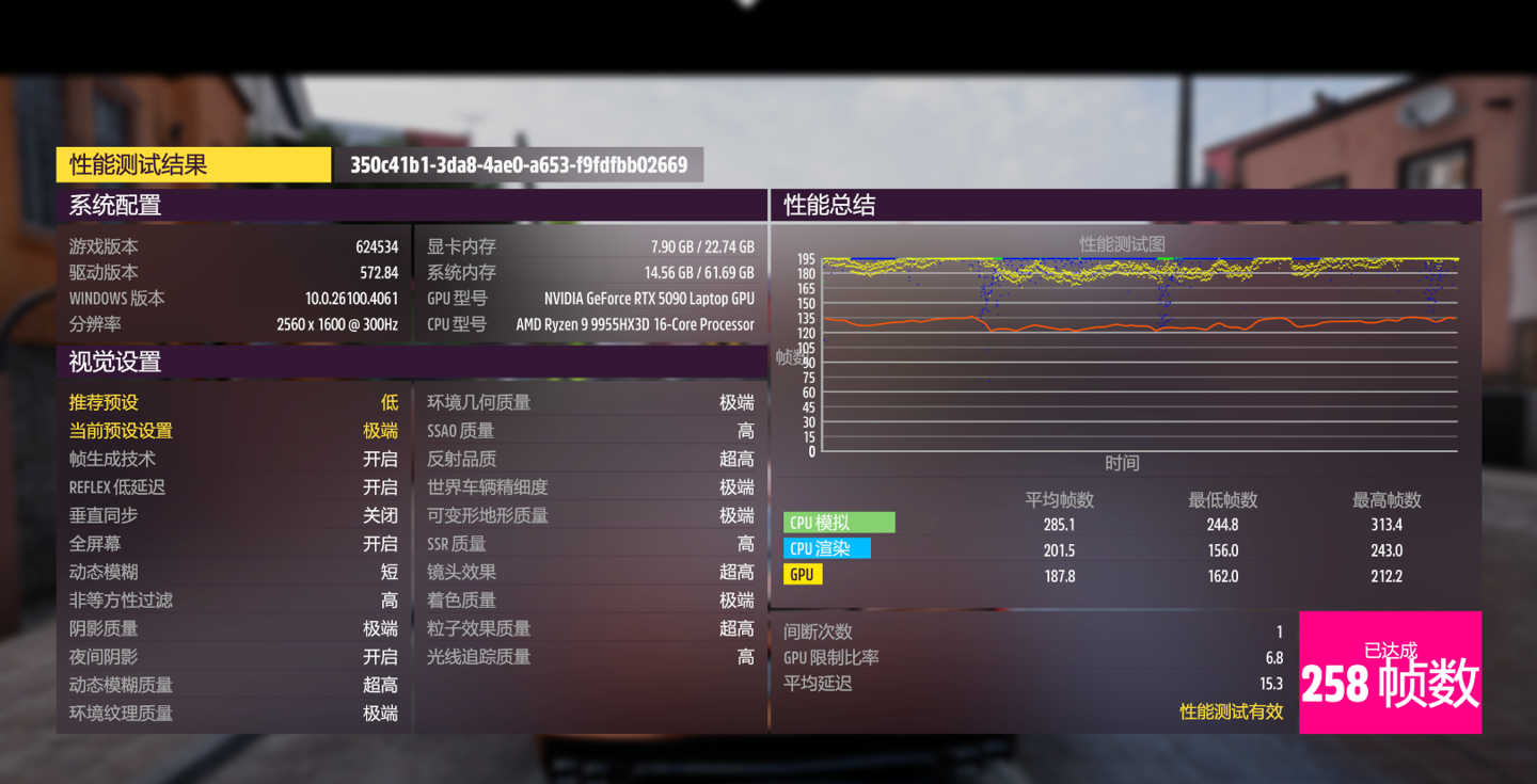 最后开启 DLSS 帧生成技术,运行基准测试,得到平均帧率为 258 FPS,提升显著。