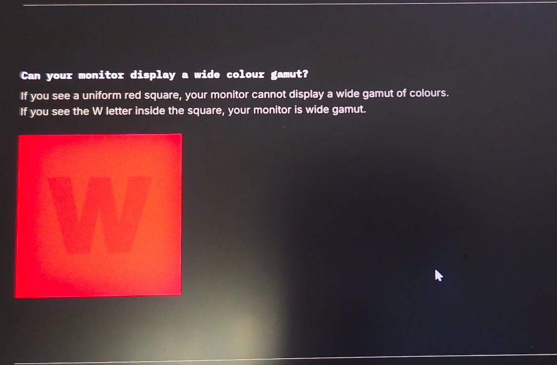 比如小编打开 Gamut 的屏幕测试网站,下面这块红色色块,只有支持 P3 广色域的屏幕,才能在红色色块中看到一个“W”字母,使用苍龙 16 Ultra 的屏幕,在 Display P3 色域下,能够清楚看到这个“W”字母,说明这块屏幕能显示非常丰富的色彩。