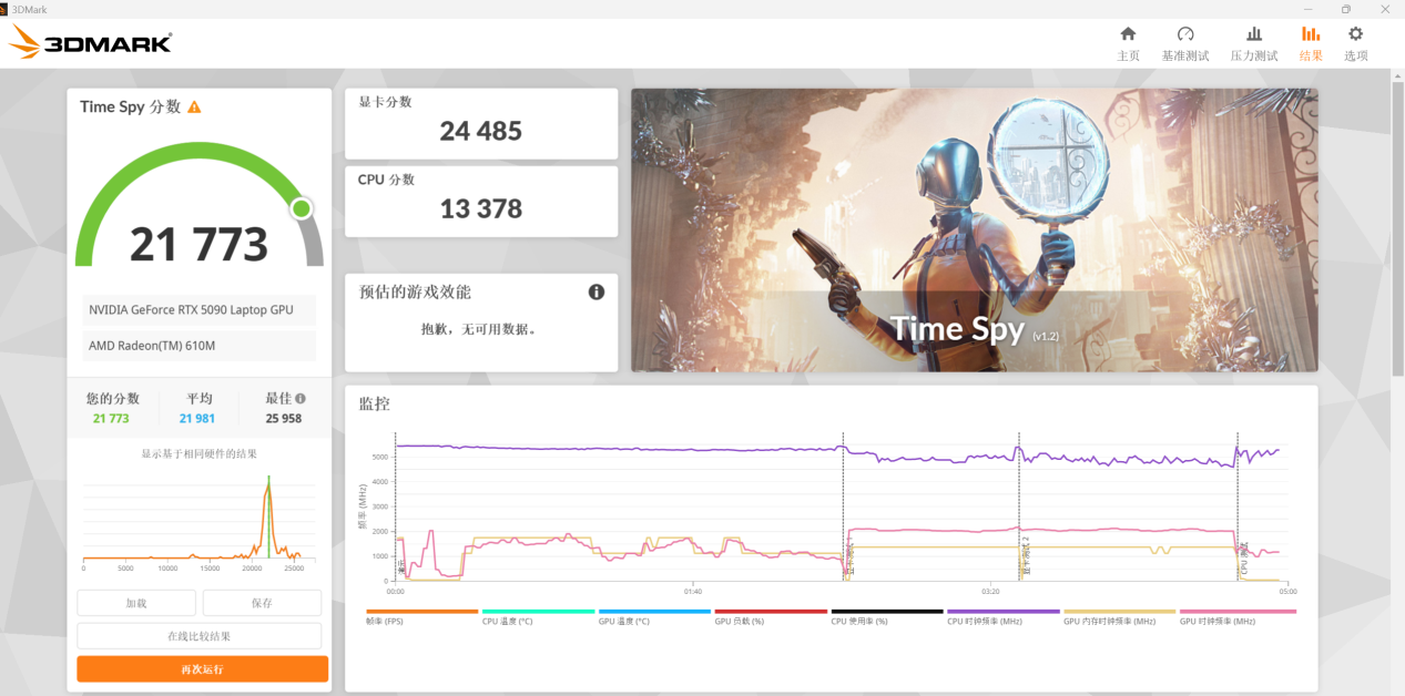 CPU 测完之后我们看 GPU 的表现,还是《3DMark》,我们首先进行 Time Spy 项目测试,得到显卡分数为 24485 分,综合成绩 21773 分。