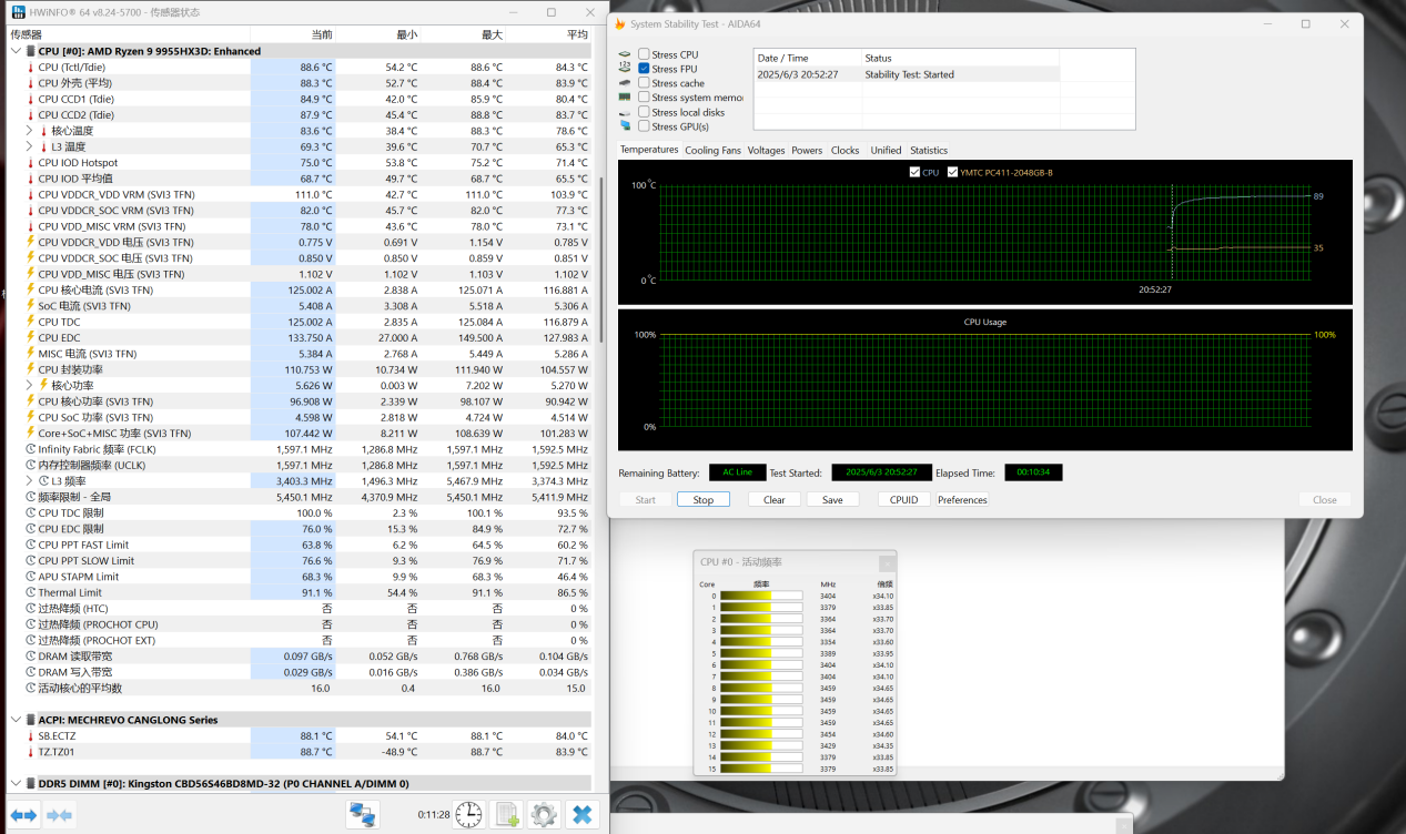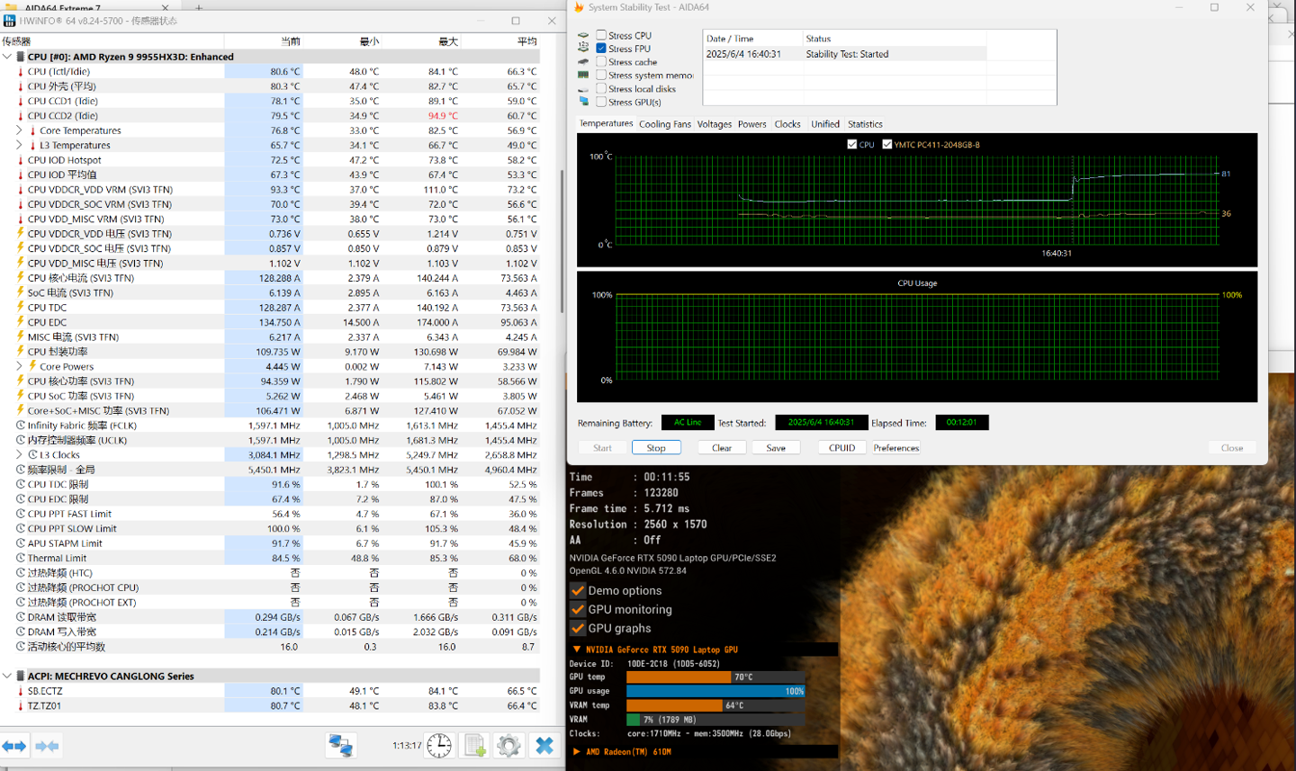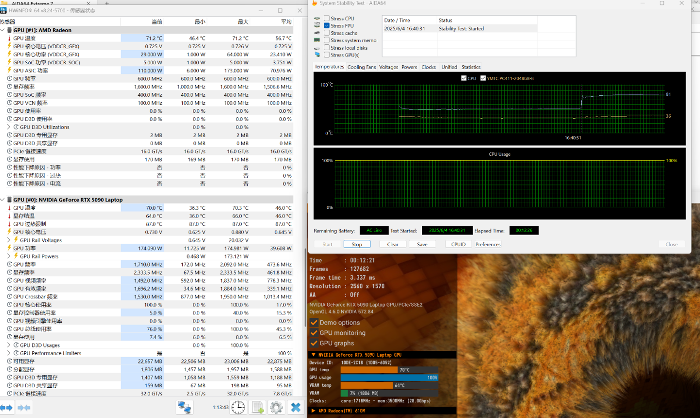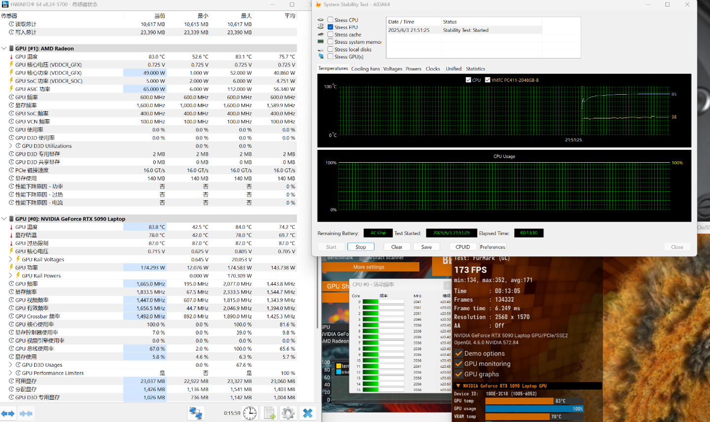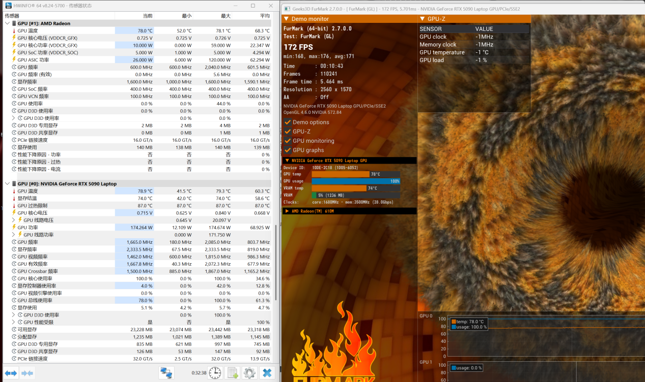 然后我们直接进行双烤,大约 10 分钟后,CPU 功率稳定在 110W 左右,GPU 功率在 174W,整机功率达到了 284W,性能释放非常猛。