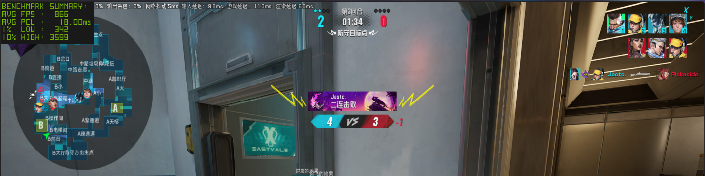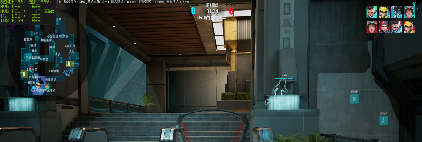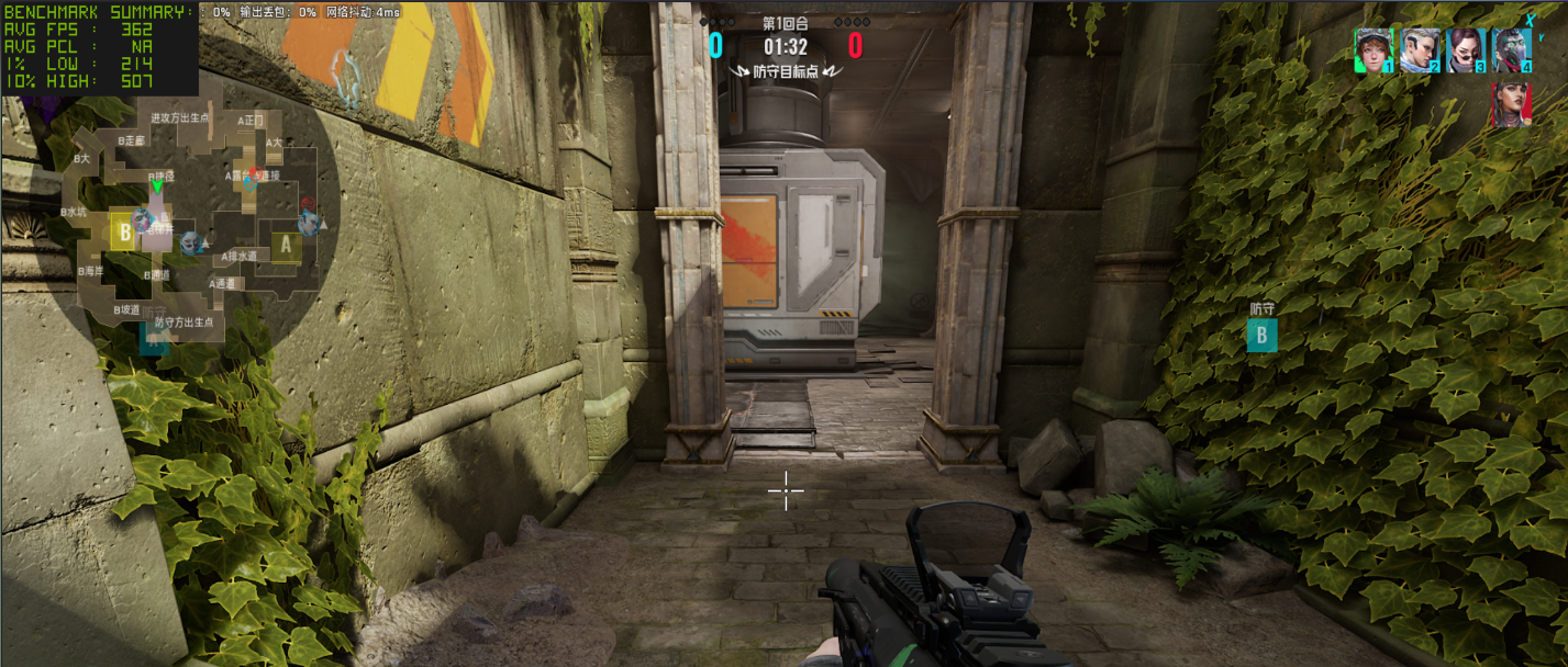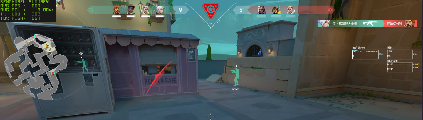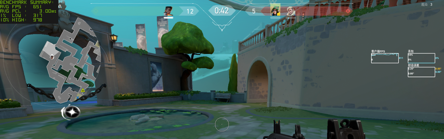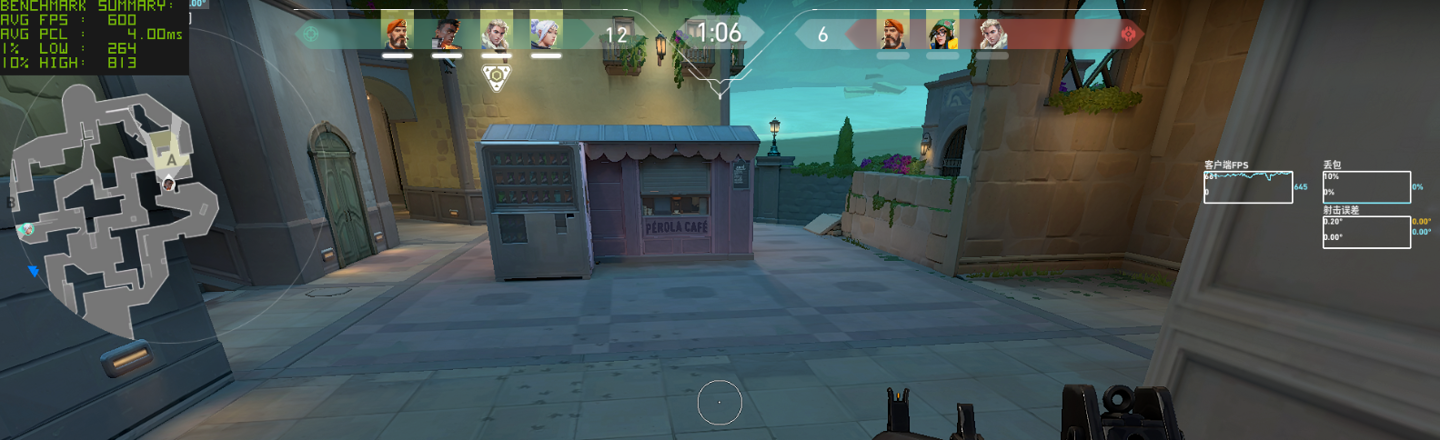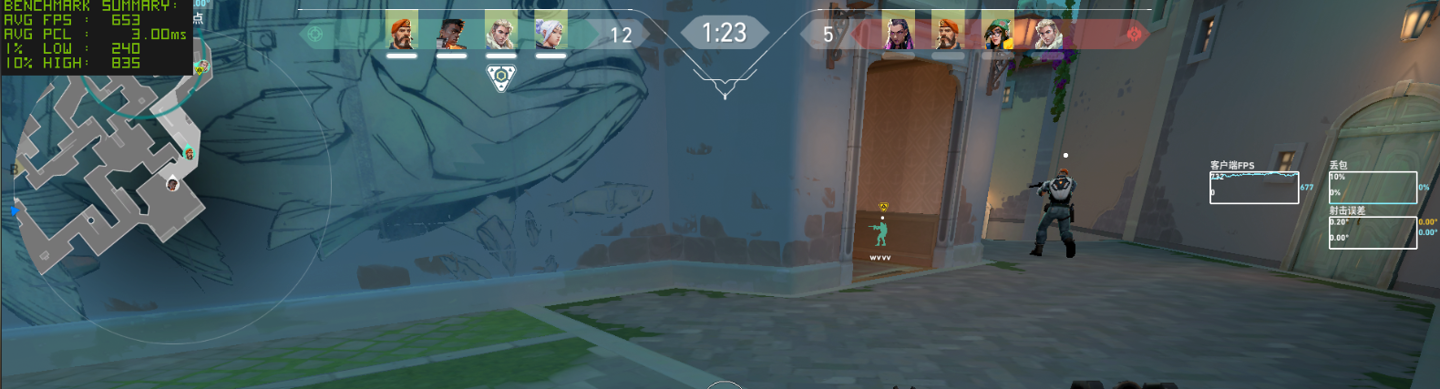 作为实时对战的竞技游戏,我们接着还是看看《无畏契约》在局内对战时的表现,需要注意的是这种电竞游戏的帧率在实时对战时可能受到各种因素的印象,因此小编测试的结果仅供参考。首先还是在 1080P 分辨率低画质下,测得平均帧率为 667 FPS,这个帧率表现已经是很出色了。