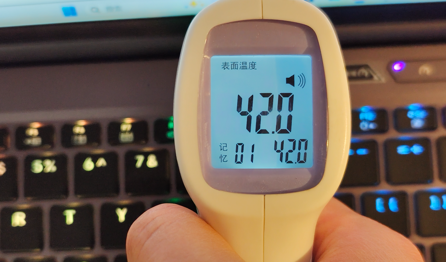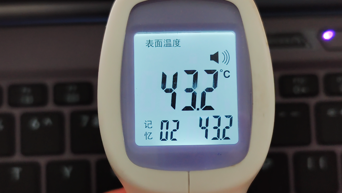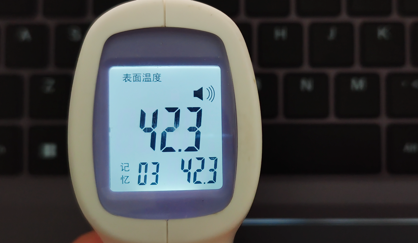 再看温度方面,键盘区域上方温度为 43.2℃,而键盘区域中间为 42.3℃。