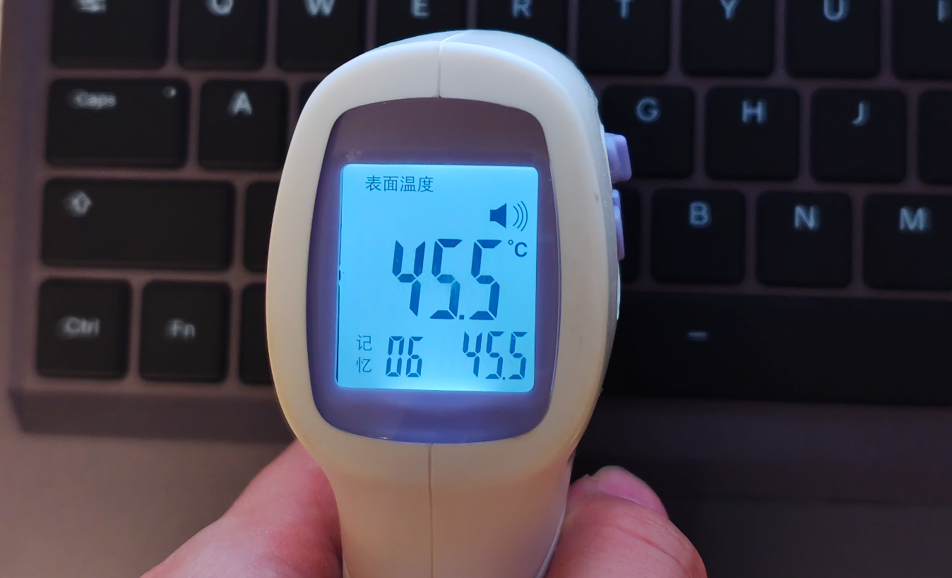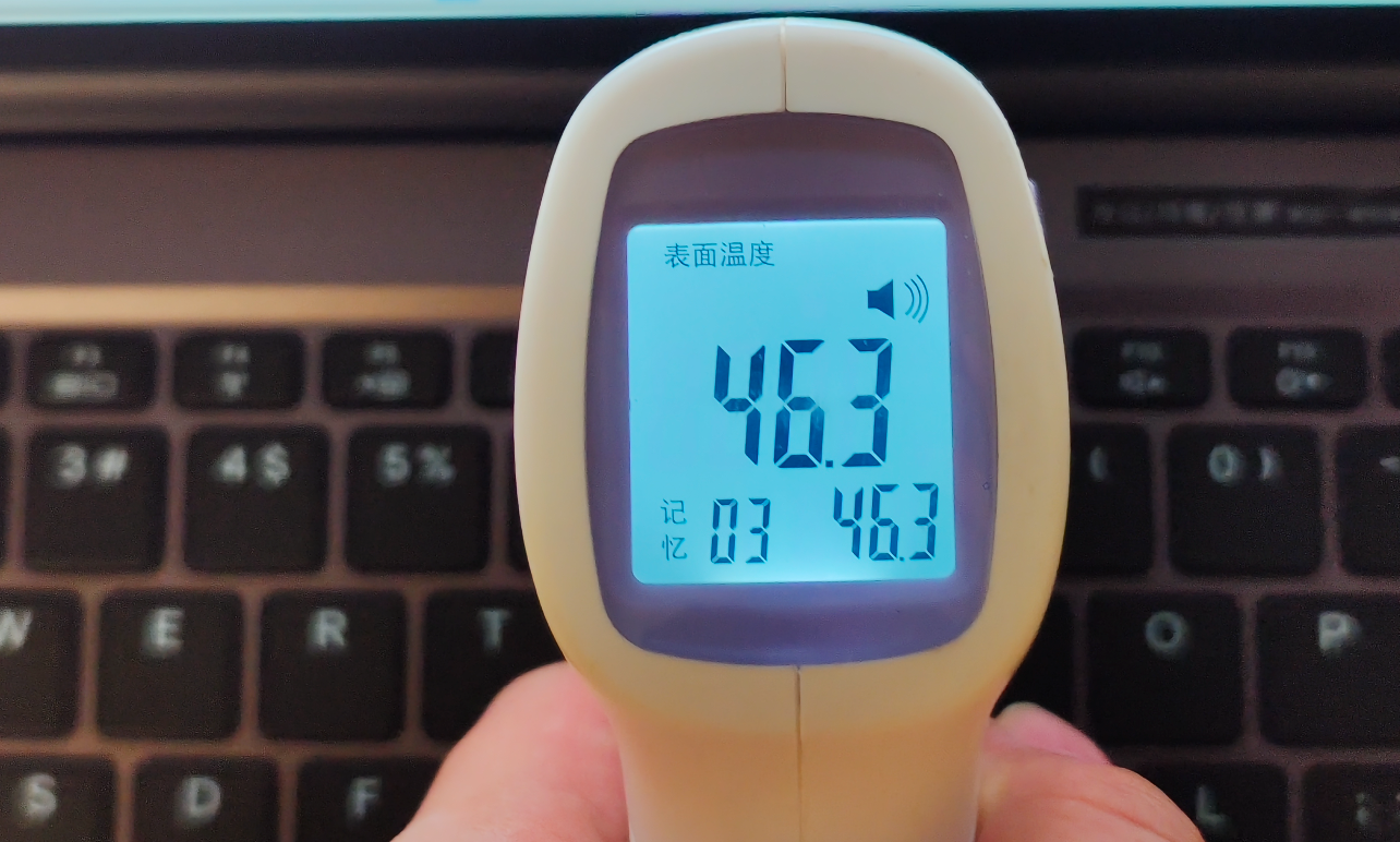 此时小编实测机身温度最高在键盘区域上方,达到 46.3℃,键盘中间区域温度大约在 45.5℃。