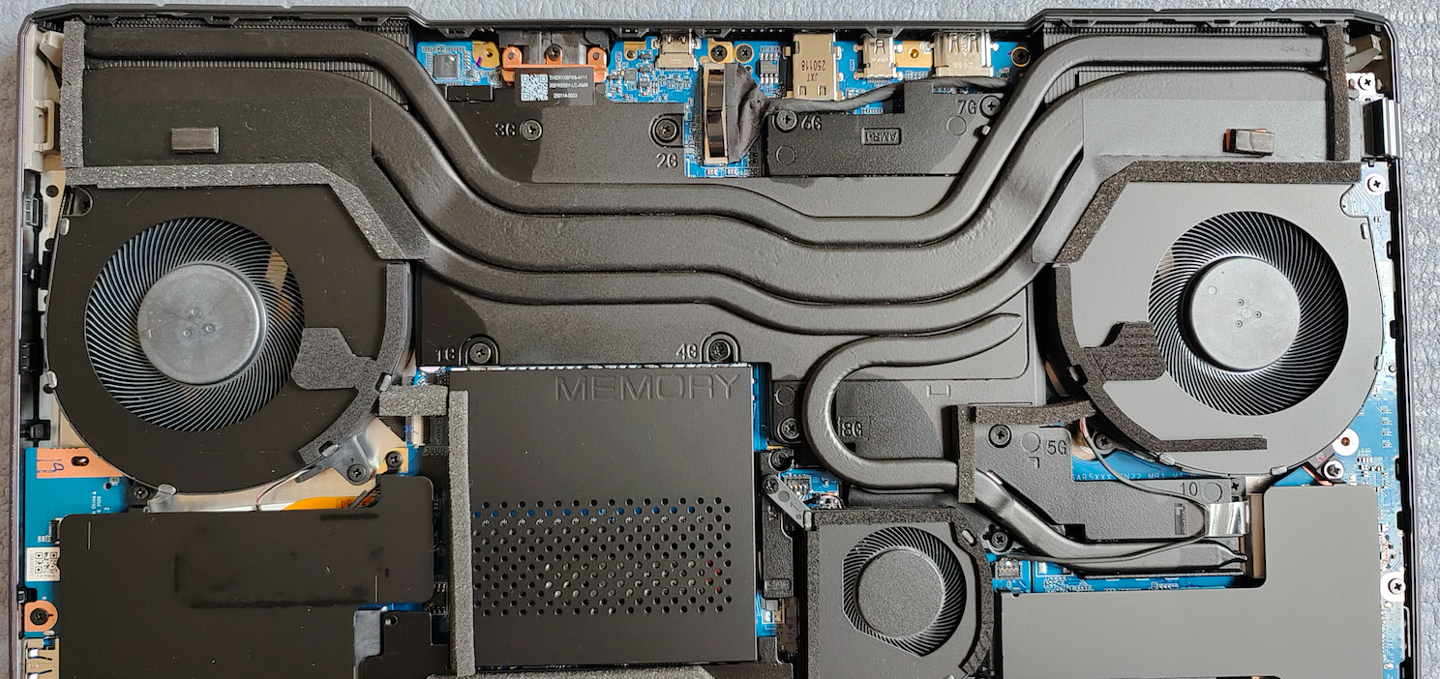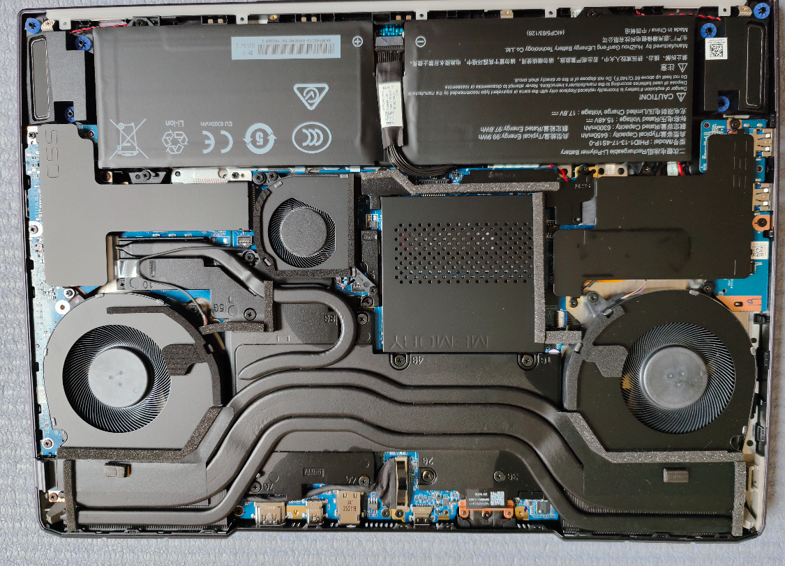 在测试之前我们先简单拆机看一下苍龙 16 Ultra 的内部,这款游戏本拆除 D 壳还是比较简单的,只需要卸下螺丝即可。打开后一眼看去笔记本内部的构造设计是比较讲究的,关键部件都用黑色的马甲进行了覆盖,让内部整体看起来很规整。