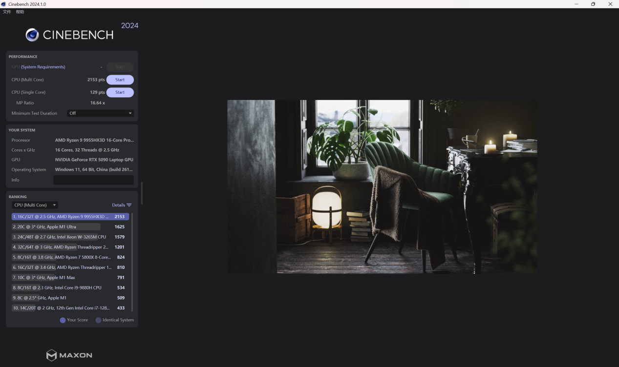 在 CineBench 2024 的测试中,CPU 单核分数为 129 分,多核分数为 2153 分,这个成绩表现也很出色。