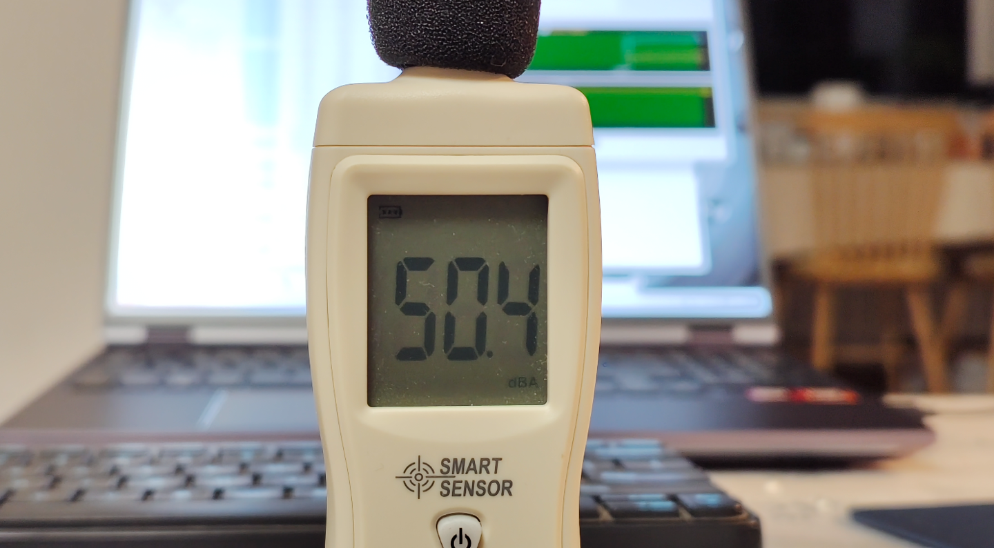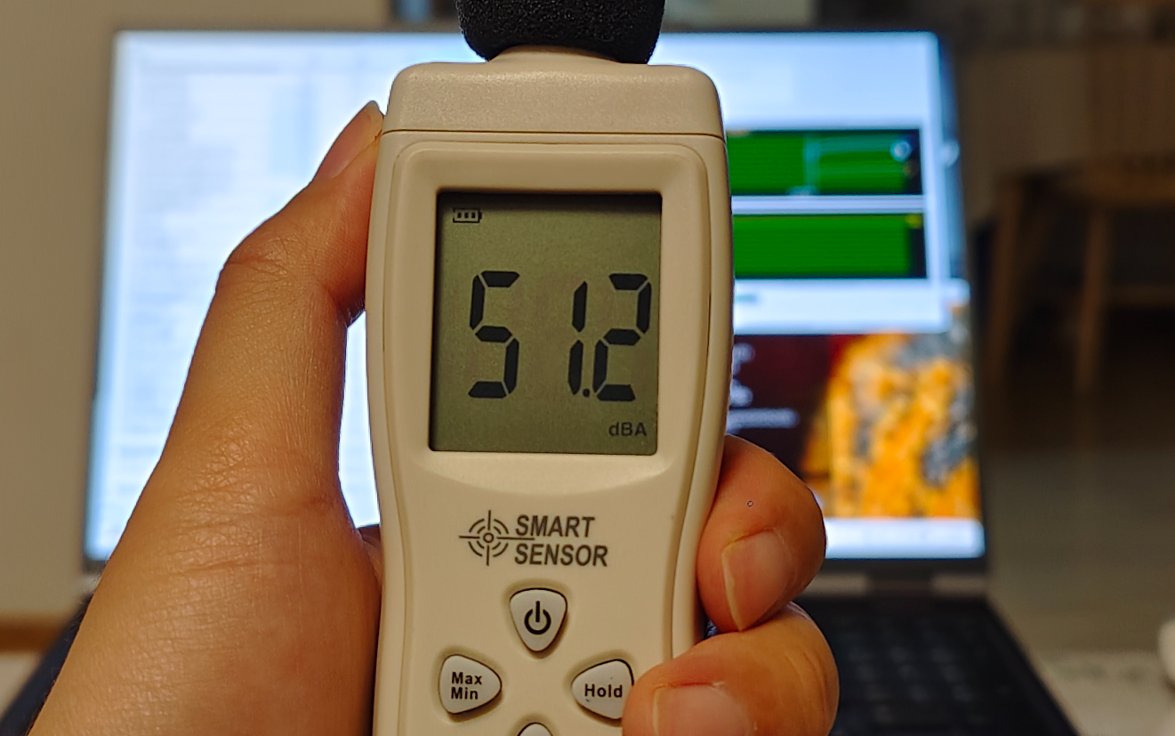 此时在正常使用电脑的位置能听到的噪音为 50.4 dBA,能听到风扇的呼呼声,但没到闹心的程度。