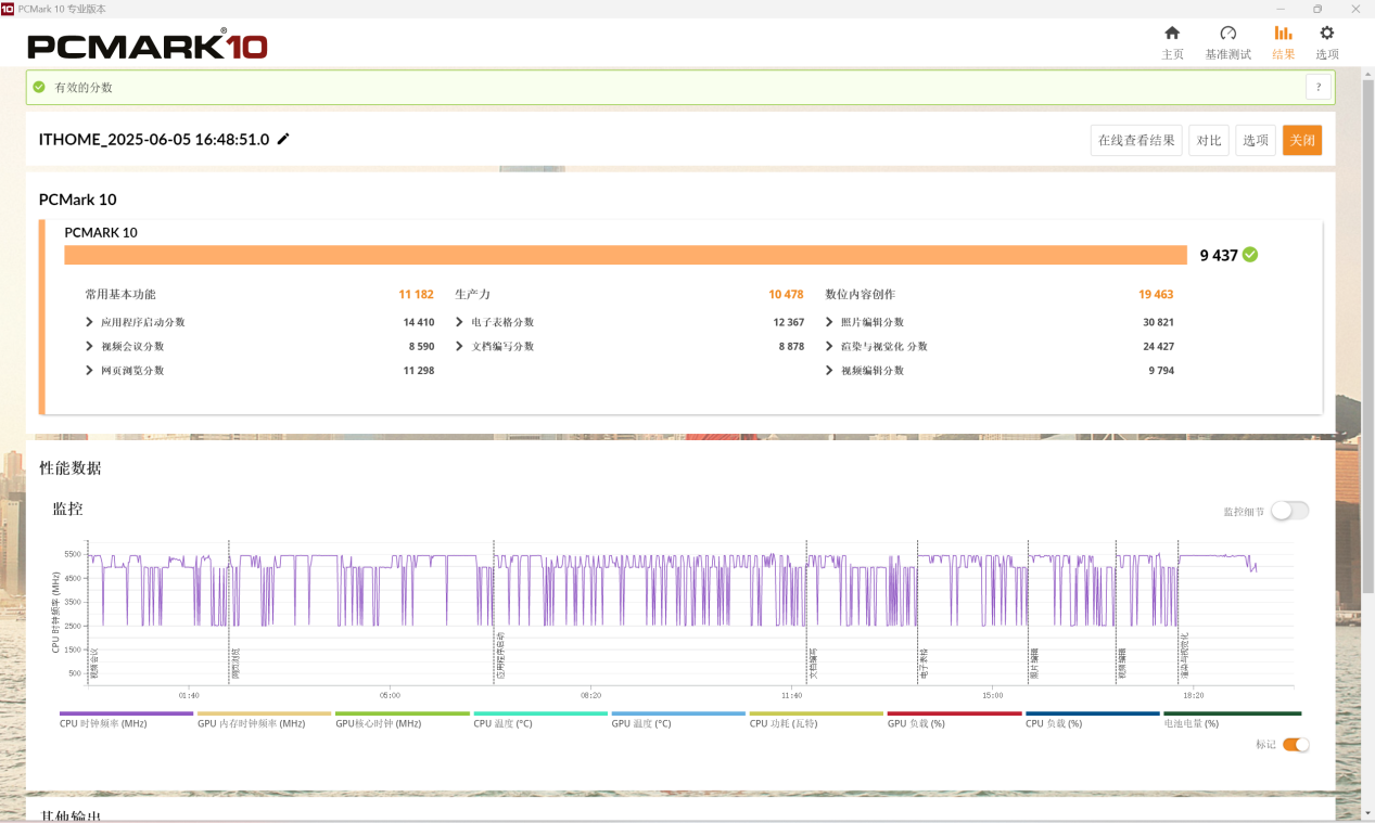 因此,IT之家也对机械革命苍龙 16 Ultra 进行了办公能力的测试。首先是 PC Mark 10 的现代办公基准测试,IT之家测得苍龙 16 Ultra 常用基本功能为 11182 分,生产力得分为 10478 分,数位内容创作为 19463 分,表现很是抢眼。