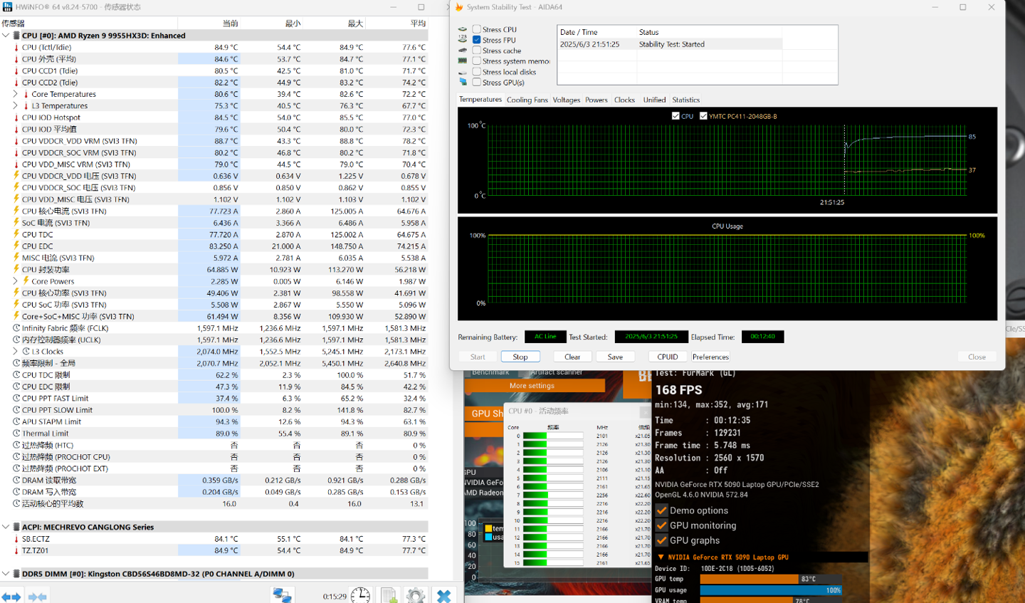下面进入实际烤机环节。烤机时笔记本设置为独显直连模式,性能输出为超能狂暴模式,我们先看不加水冷套装时的表现。先进行 AIDA 64 的 FPU 单烤,10 分钟之后 CPU 功耗大约 111W,核心温度稳定在 83.6℃左右,温度并不高。