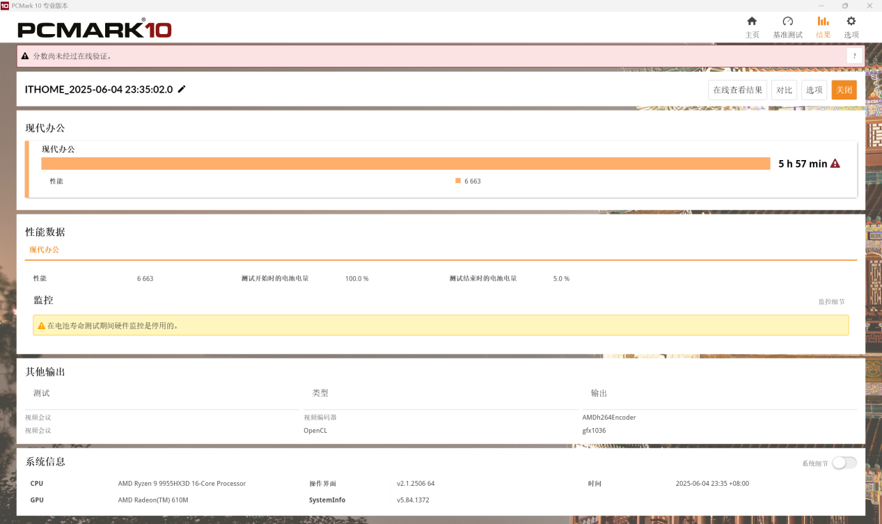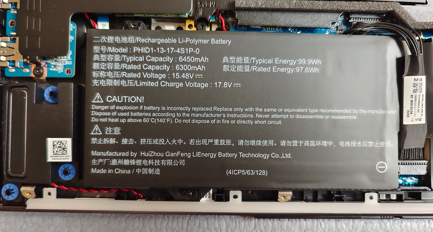 电池为 99Wh 的大容量电池。IT之家用 PC Mark 10 进行了续航实测,在 30% 亮度下测得理论续航成绩 5 小时 57 分钟。