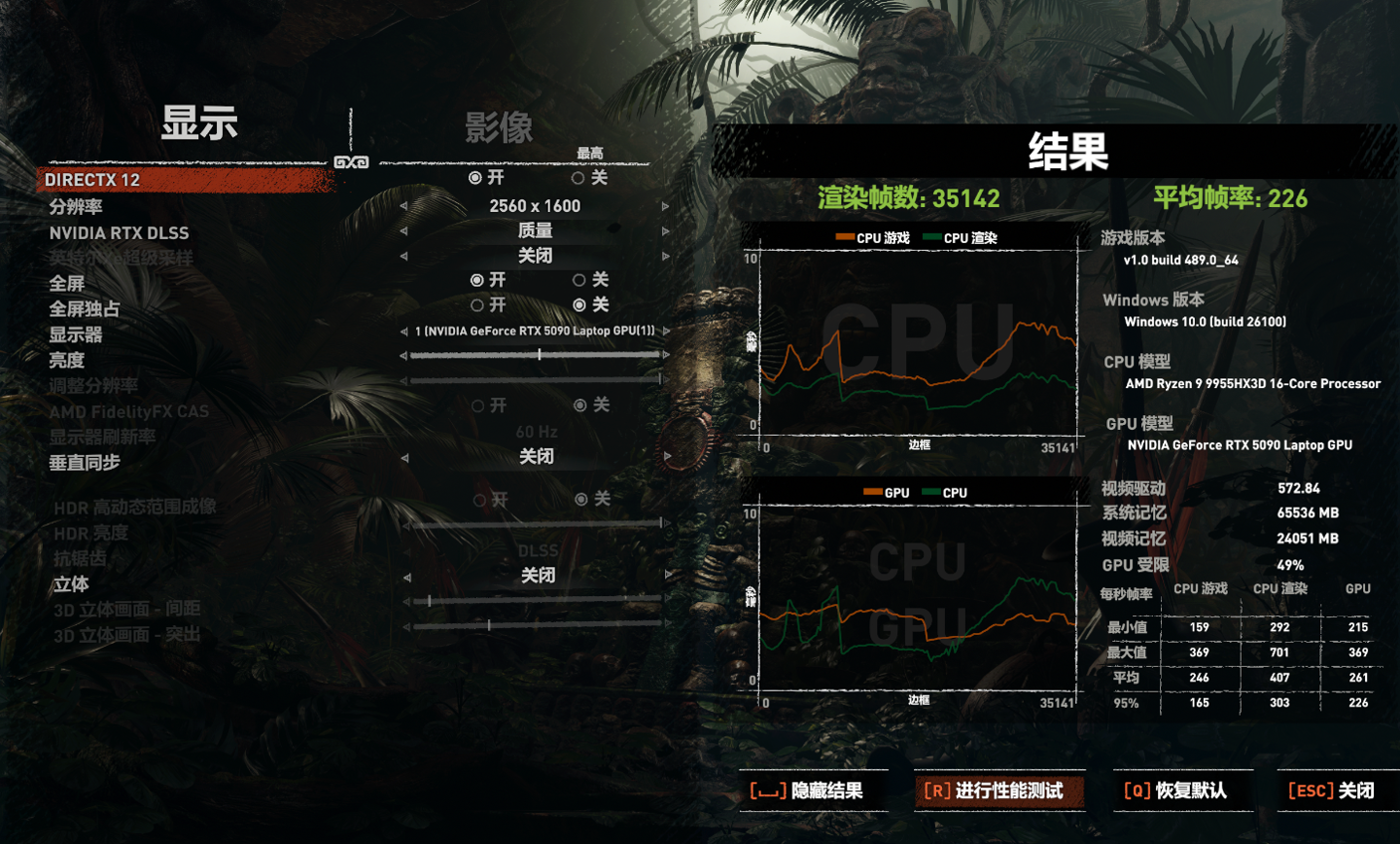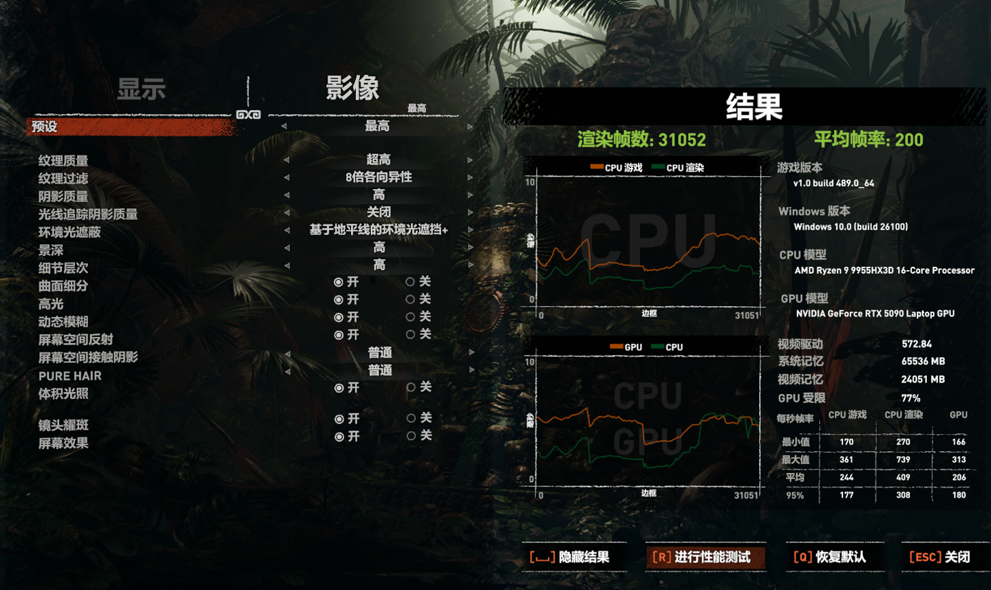 随后是单机游戏的测试,先看《古墓丽影:暗影》,使用游戏自带的基准测试,在 2.5K 最高画质下得到 200 FPS 的平均帧率,轻松无压力。