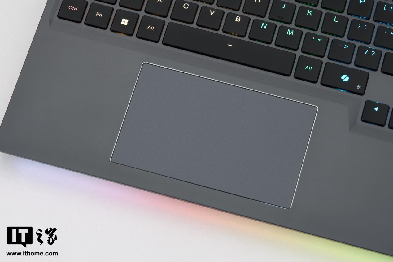 触控板面积适中,对于游戏本来说足够使用,按压手感清脆灵敏,同时四周采用了亮面抛光的包边设计,增加了精致感。
