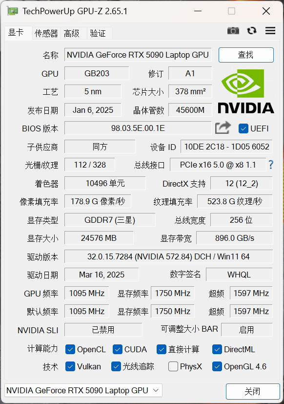 显卡为 NVIDIA GeForce RTX 5090 笔记本电脑 GPU,175W 满功耗释放,基于 Blackwell 架构设计,拥有 24GB GDDR7 大显存,同时还有 112 个 ROPs、328 个 TMUs、10496 个 CUDA 核心,核心频率 1095MHz,显存频率 1750MHz,Boost 频率 1597MHz;并拥有 256bit 显存位宽,带宽速率达到 896GB/s。