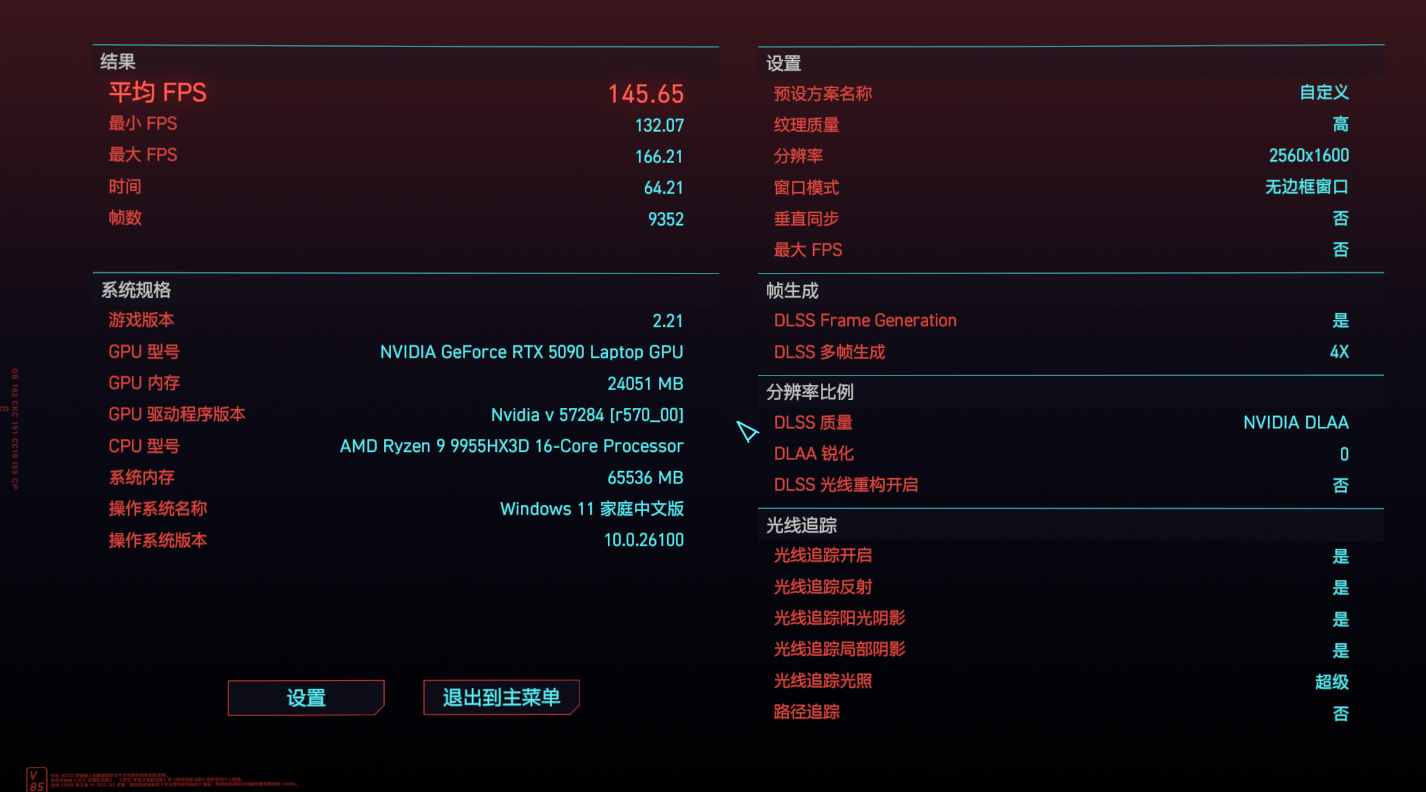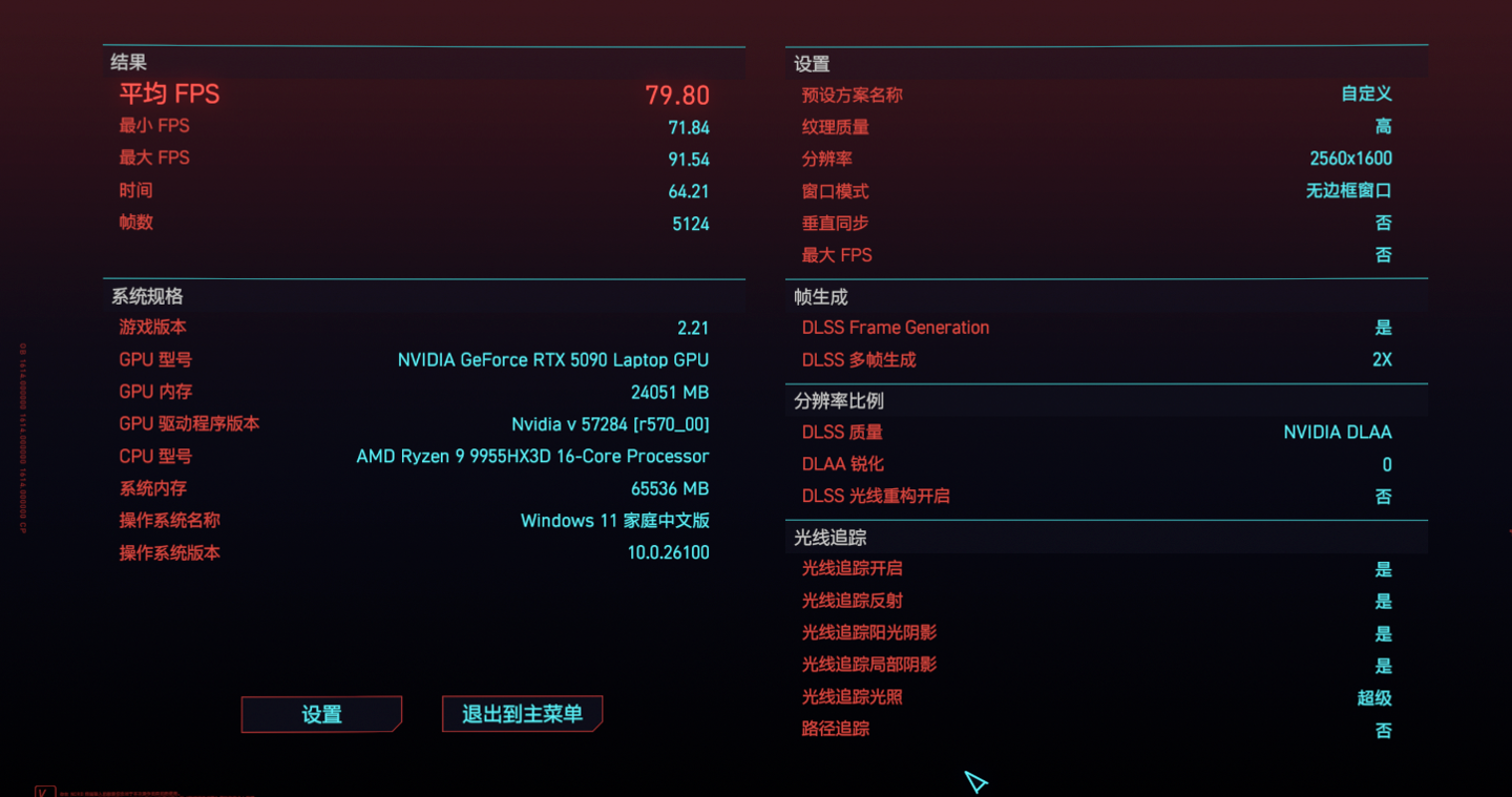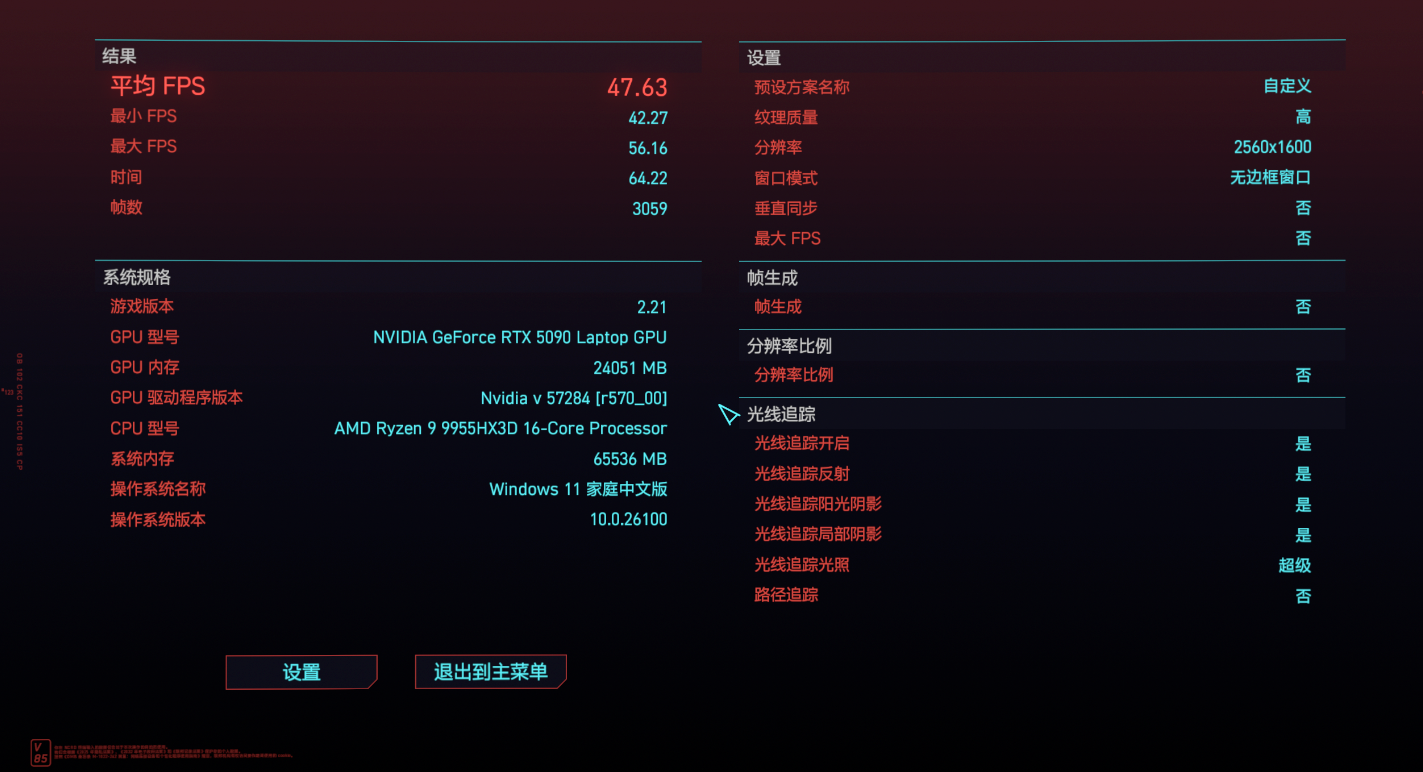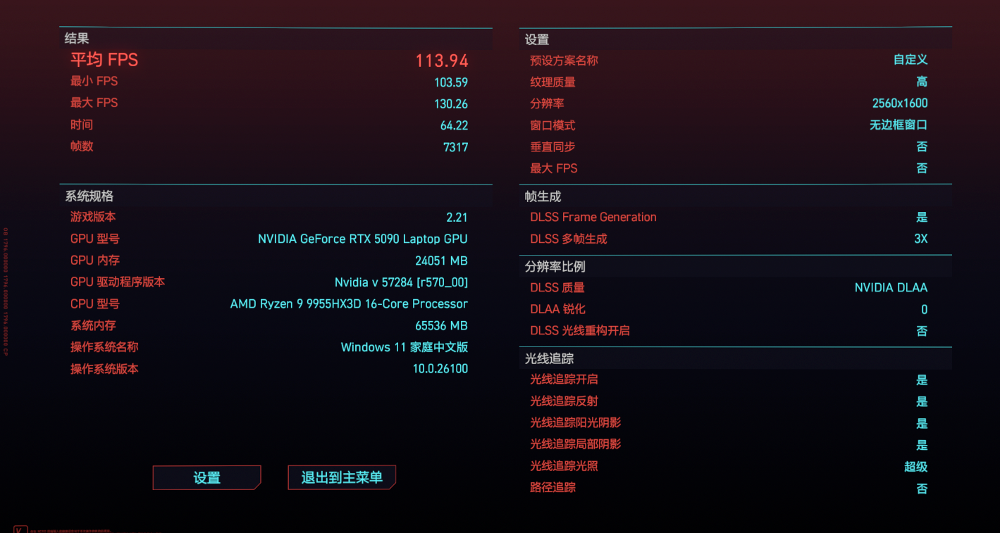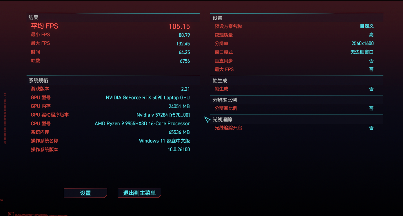 最后是对性能要求更高的《赛博朋克:2077》,当然也可以更充分地展现 RTX 5090 的游戏性能。首先是在 2.5K 分辨率搭配超级画质选项,运行游戏自带的基准测试,可以看到平均帧数能达到 105.15 fps,实际游玩起来已经非常流畅了。