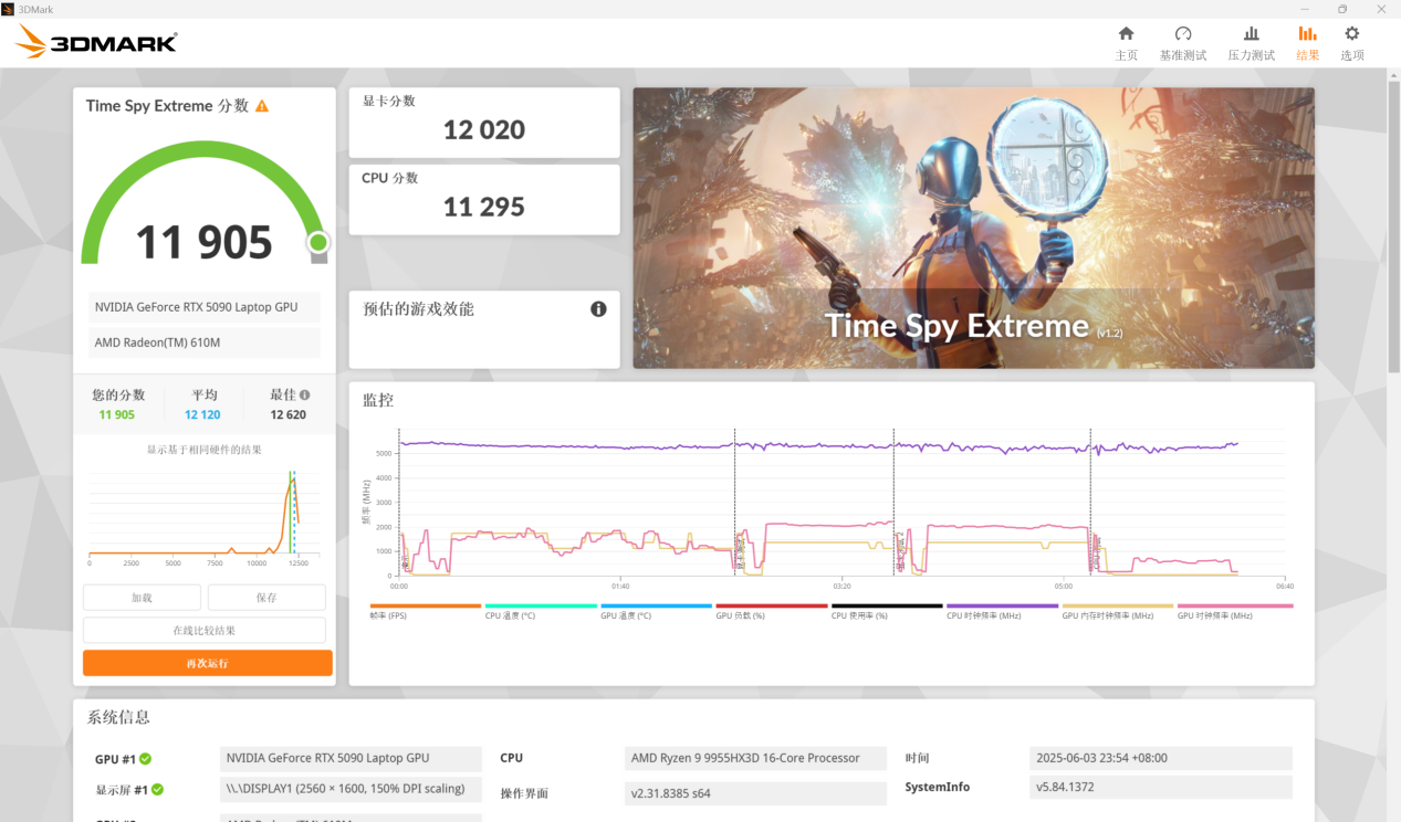 在 Time Spy Extreme 项目中,RTX 5090 GPU 显卡得分 12020 分,综合成绩为 11905 分。