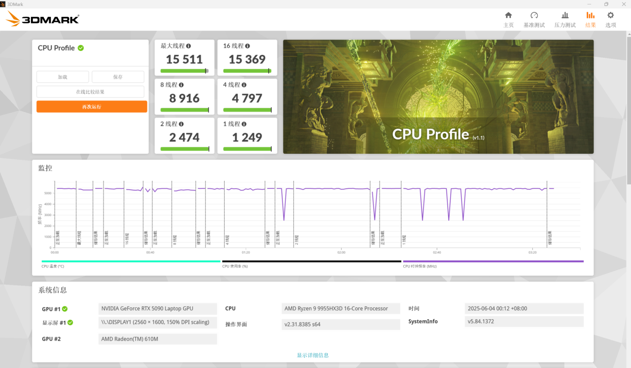 在《3DMark》中进行代表 CPU 理论性能的 CPU Profile 项目测试,得到锐龙 9 9955HX3D 单线程 1249 分,最大线程 15511 分。