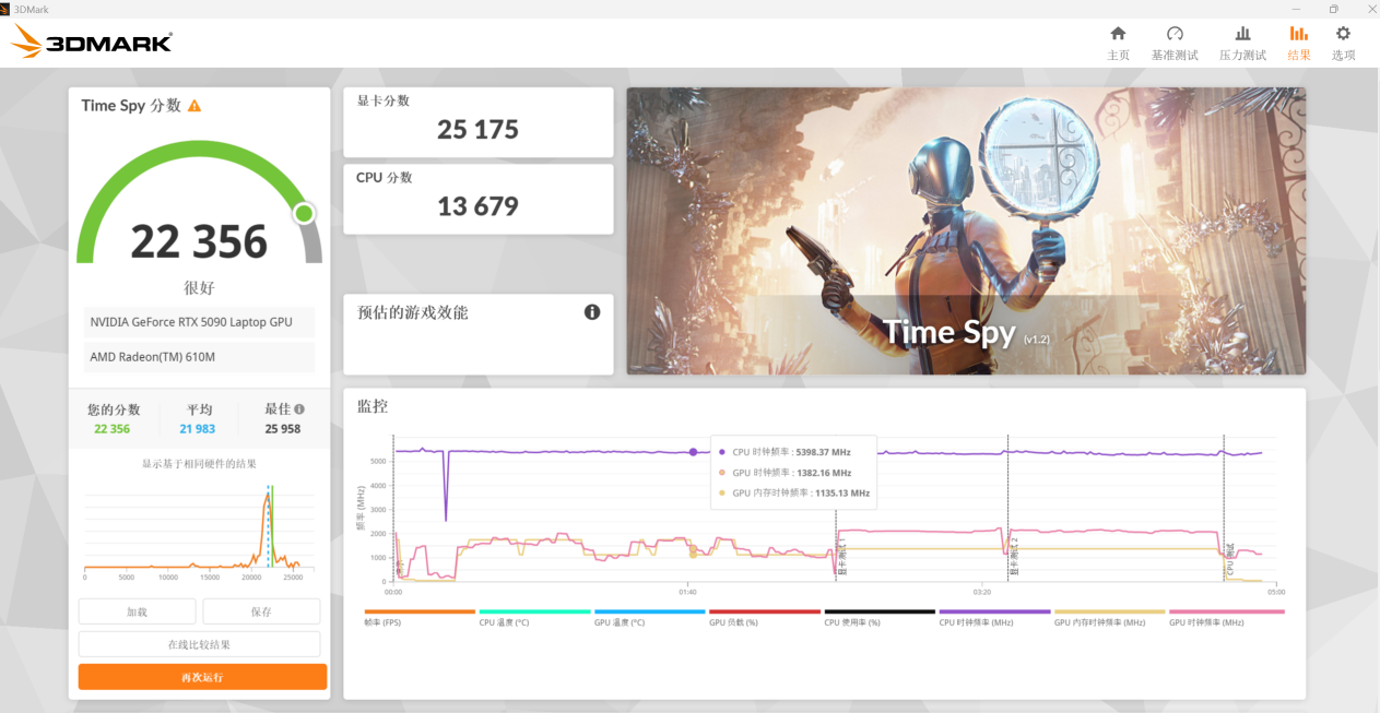 然后是《3DMark》 Time Spy 项目,显卡分数 25175 分,综合得分为 22356 分,继续更进一步。