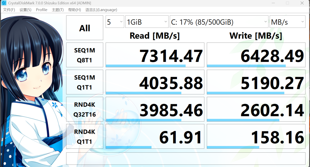 针对这块 SSD,IT之家使用 CrystalDiskMark 做了读写性能的测试,得到 SEQ1MQ8T1 读取速度为 7314.47 MB/s,写入速度达到 6428.49 MB/s。